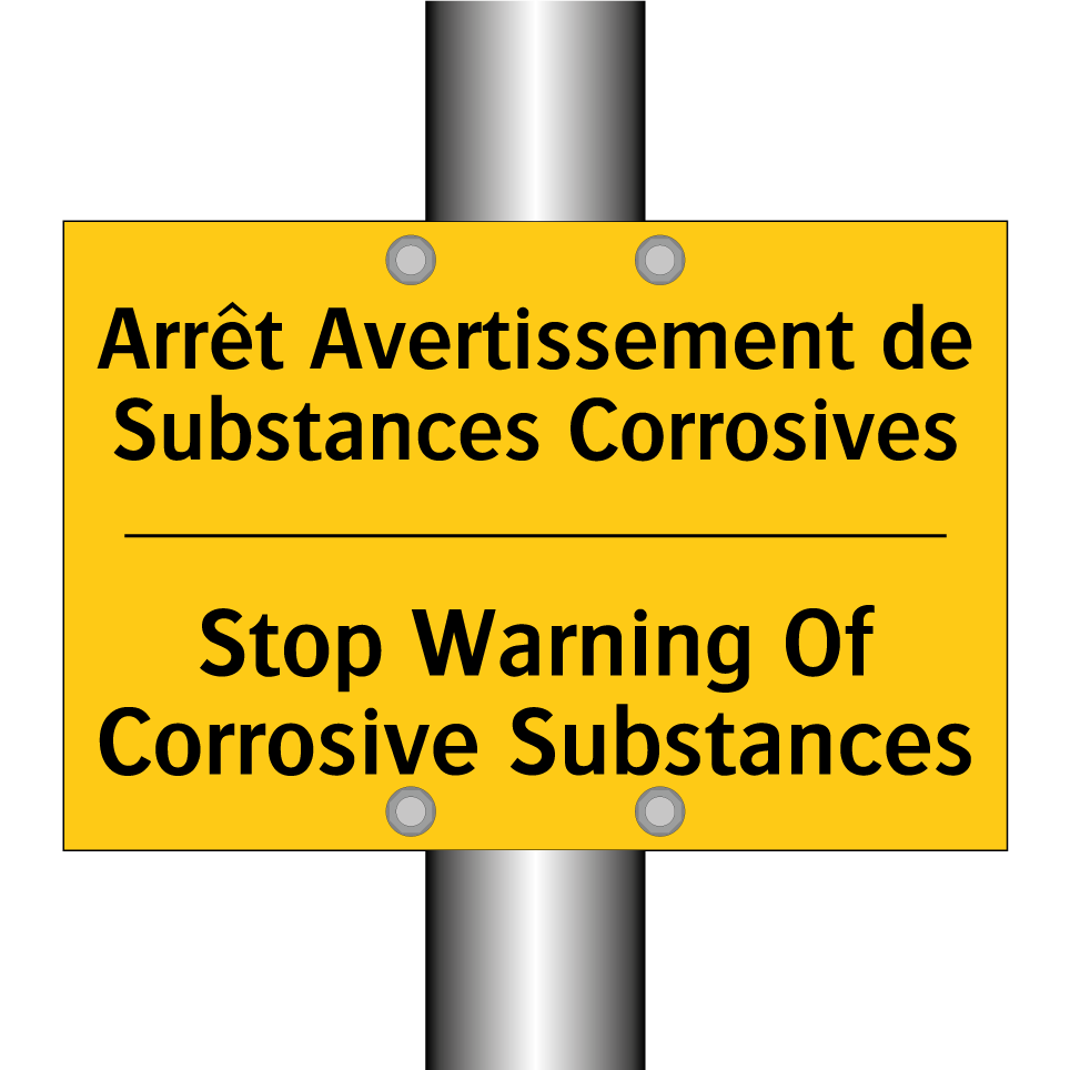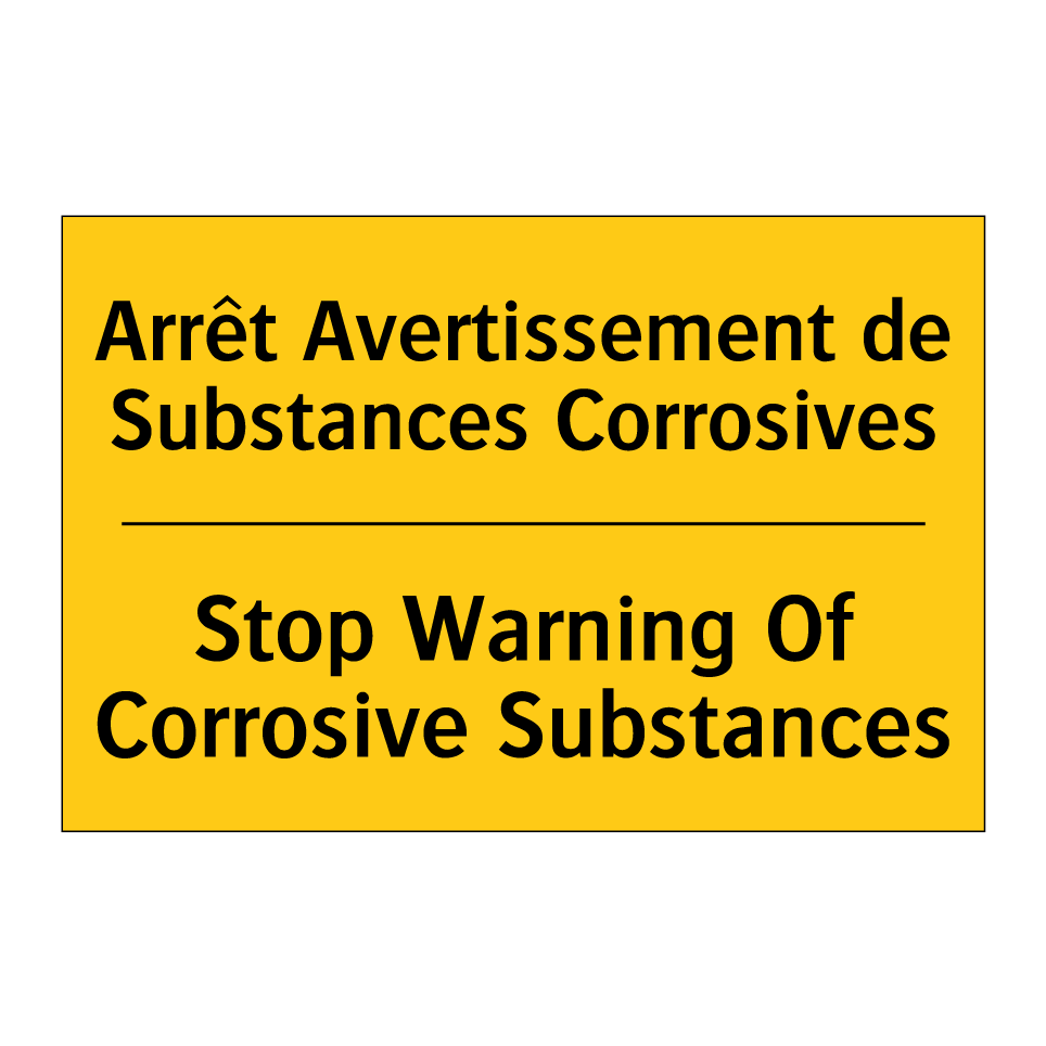Panneau d'avertissement bilingue avec texte en français : "Arrêt Avertissement de Substances Corrosives", et en anglais : "Stop Warning Of Corrosive Substances"