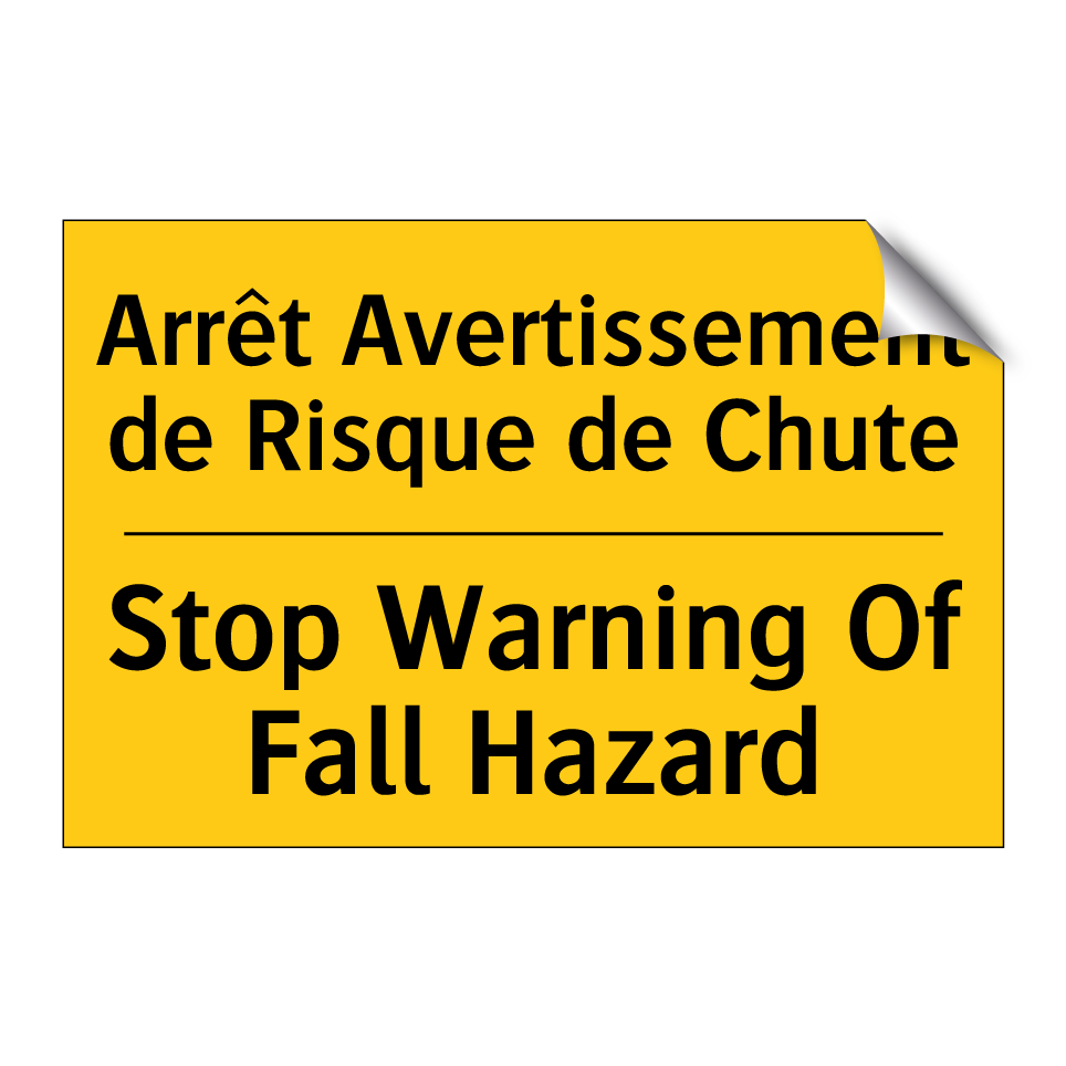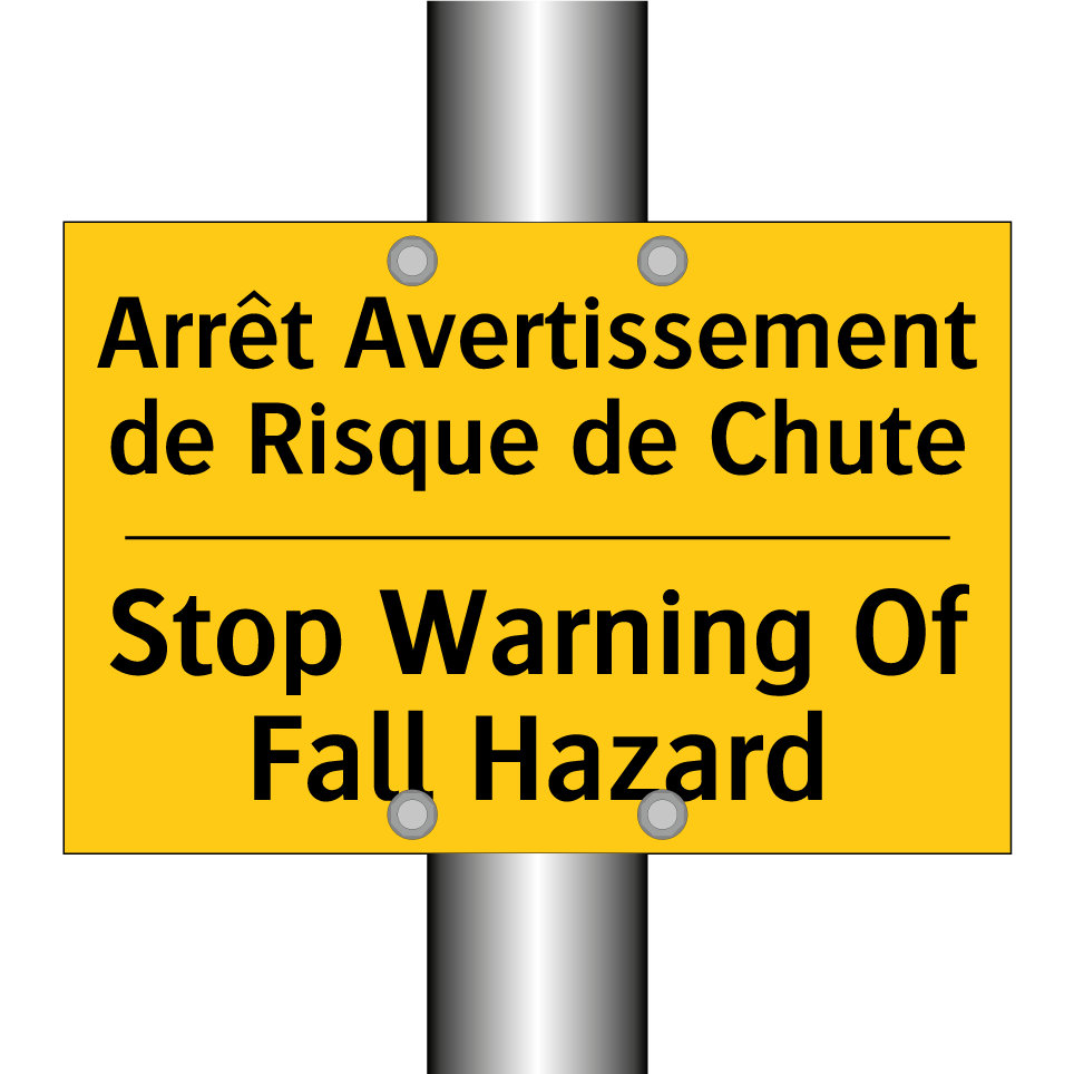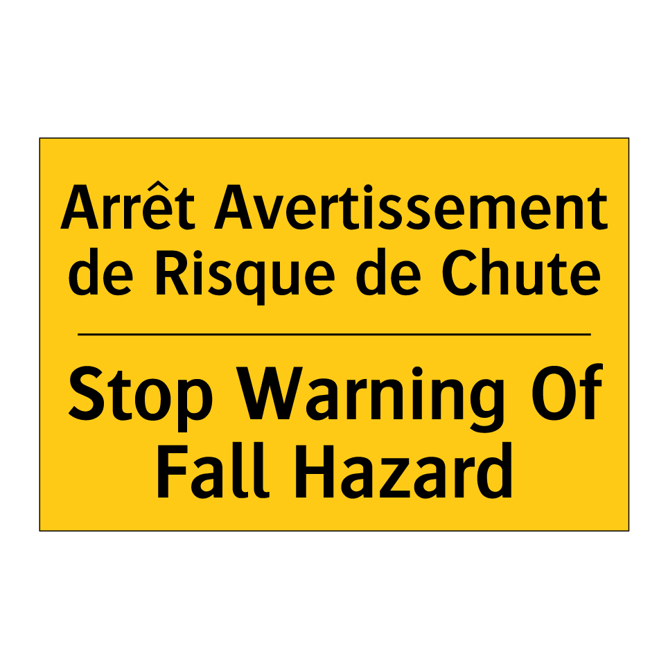 Panneau d'avertissement bilingue avec texte en français : "Arrêt Avertissement de Risque de Chute", et en anglais : "Stop Warning Of Fall Hazard"