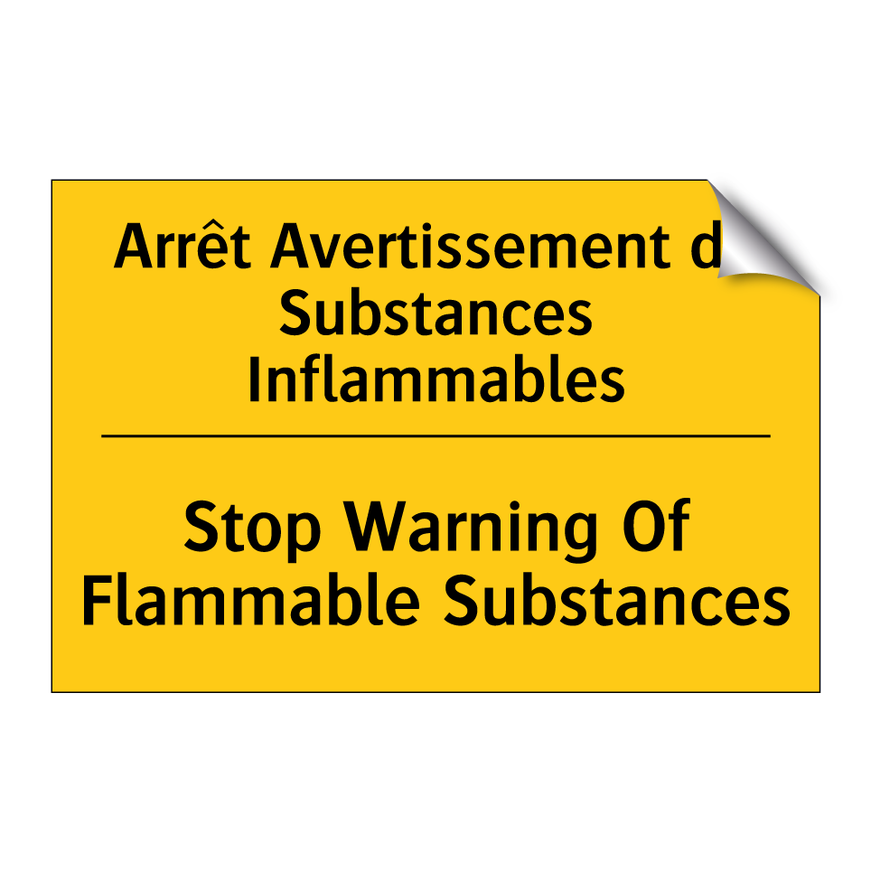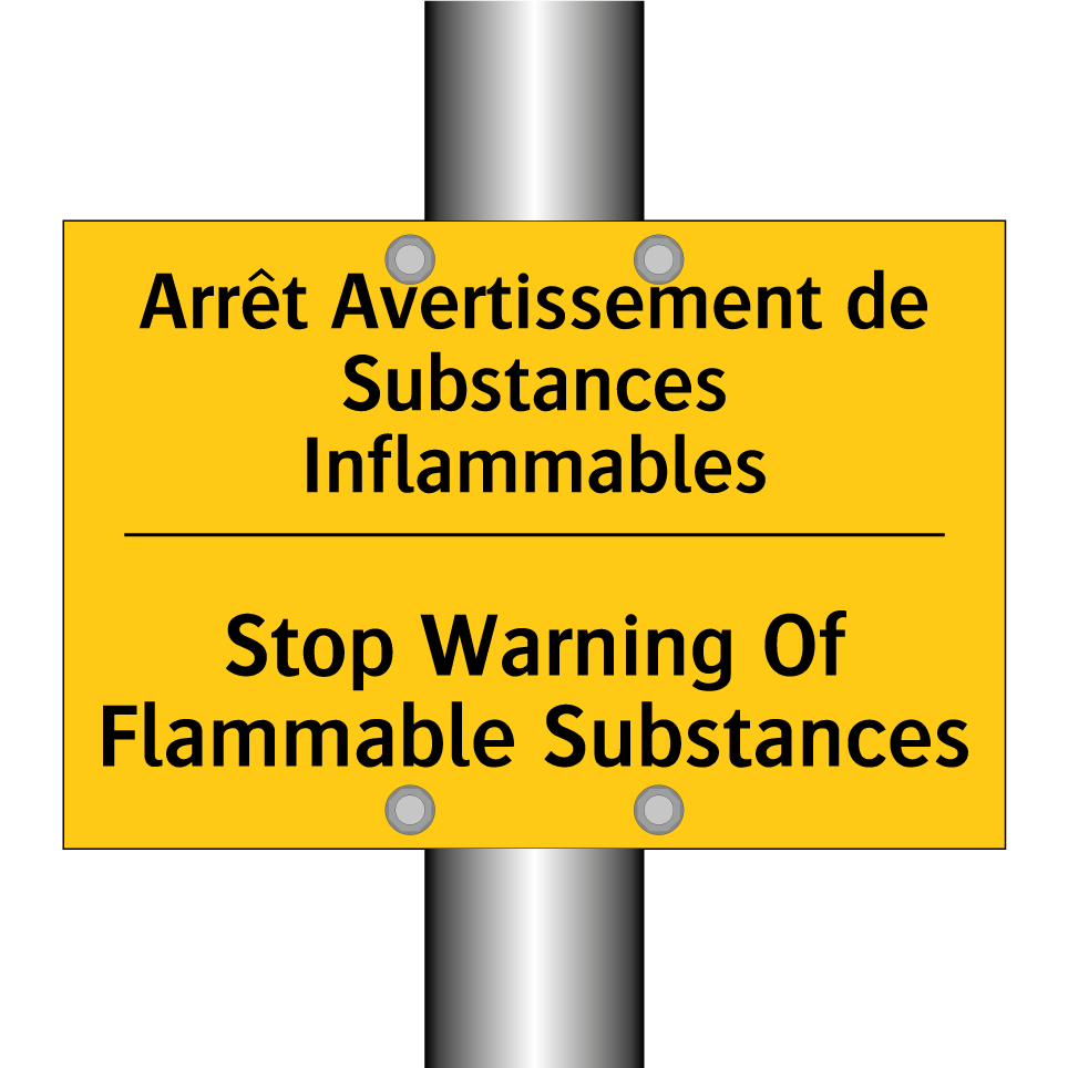 Panneau d'avertissement bilingue avec texte en français : "Arrêt Avertissement de Substances Inflammables", et en anglais : "Stop Warning Of Flammable Substances"