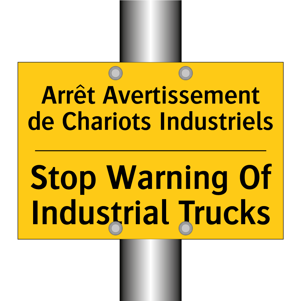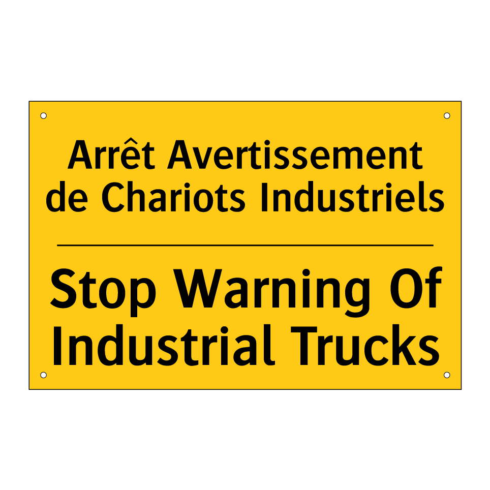 Panneau d'avertissement bilingue avec texte en français : "Arrêt Avertissement de Chariots Industriels", et en anglais : "Stop Warning Of Industrial Trucks"