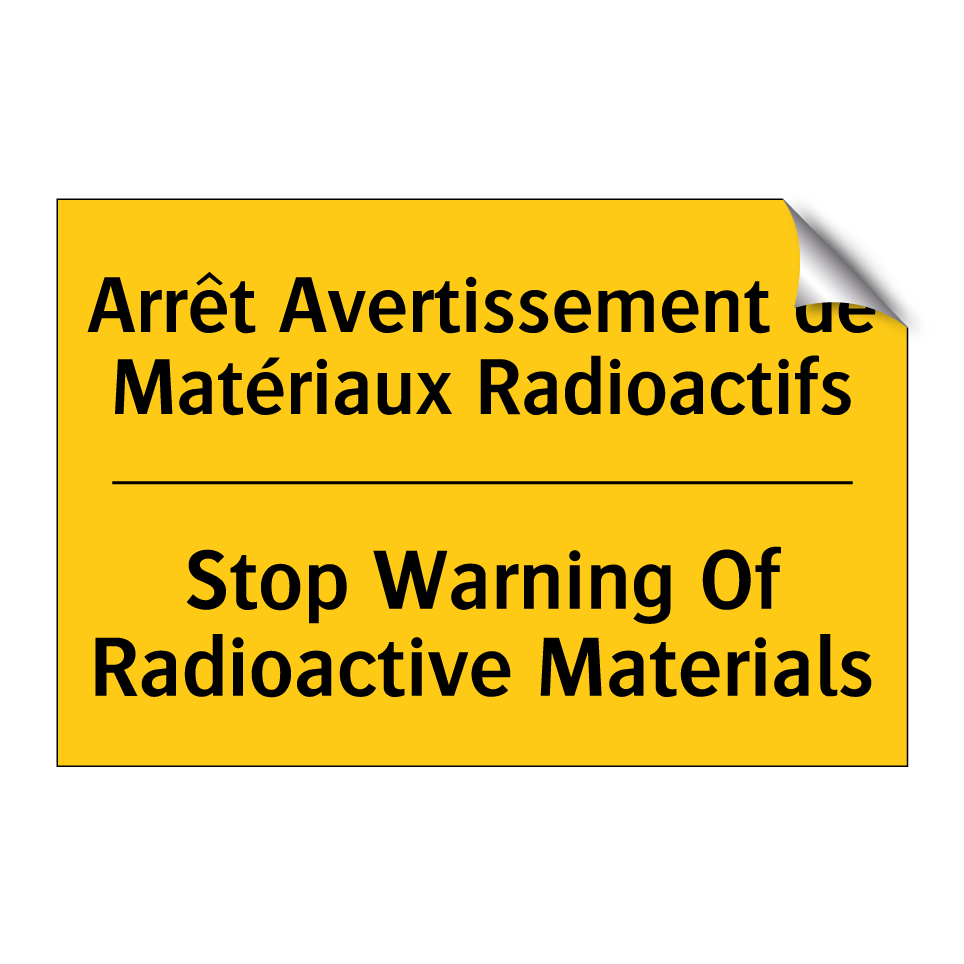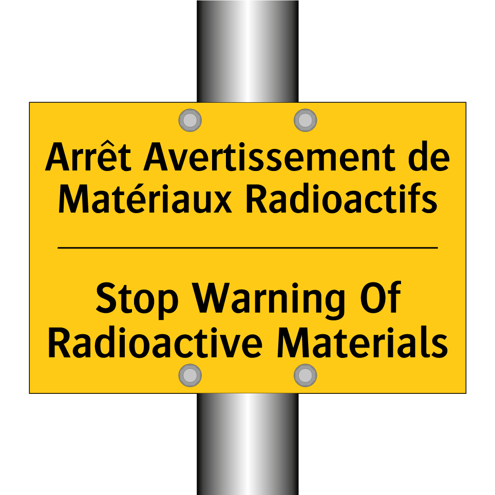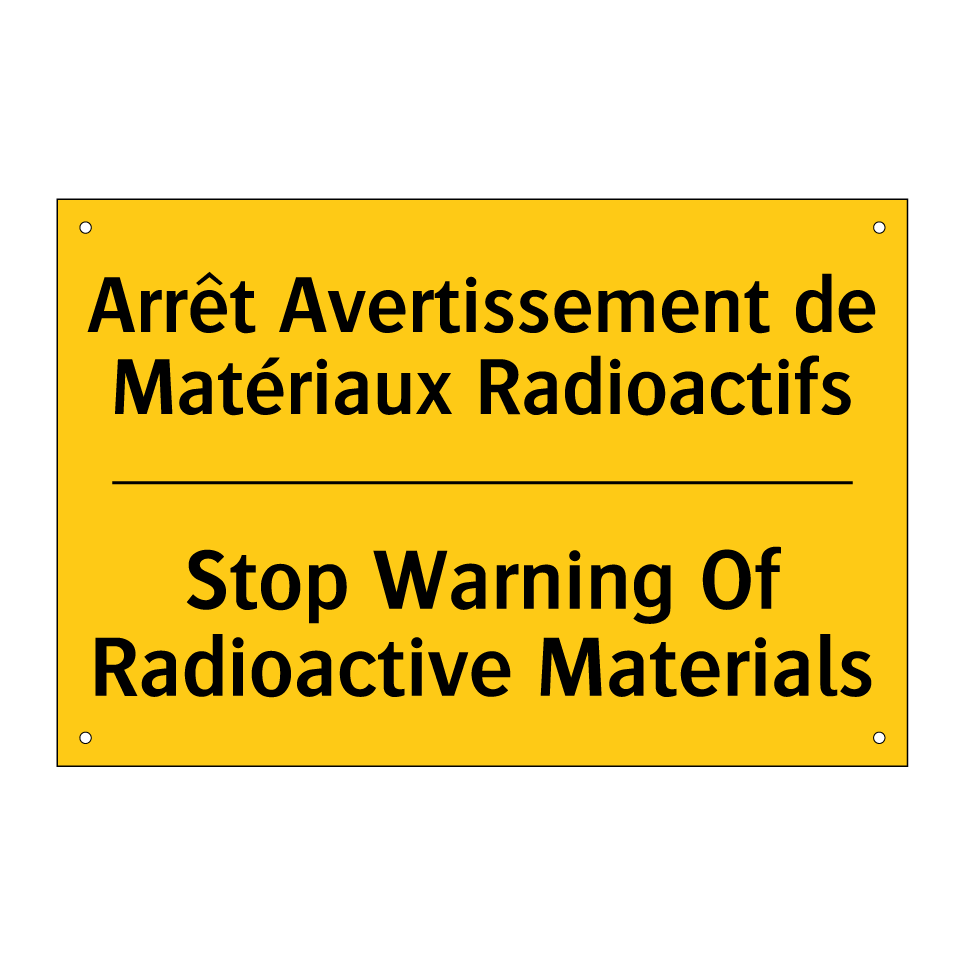 Panneau d'avertissement bilingue avec texte en français : "Arrêt Avertissement de Matériaux Radioactifs", et en anglais : "Stop Warning Of Radioactive Materials"