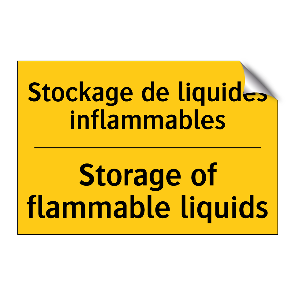 Panneau d'avertissement bilingue avec texte en français : "Stockage de liquides inflammables", et en anglais : "Storage of flammable liquids"