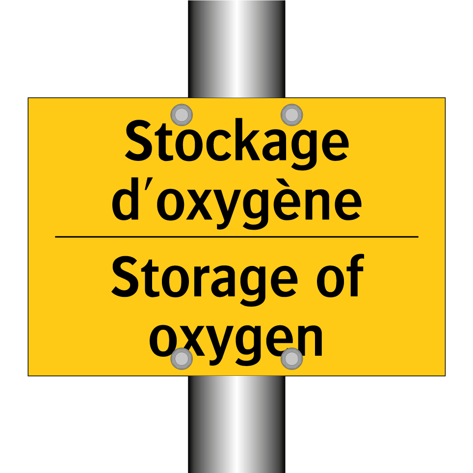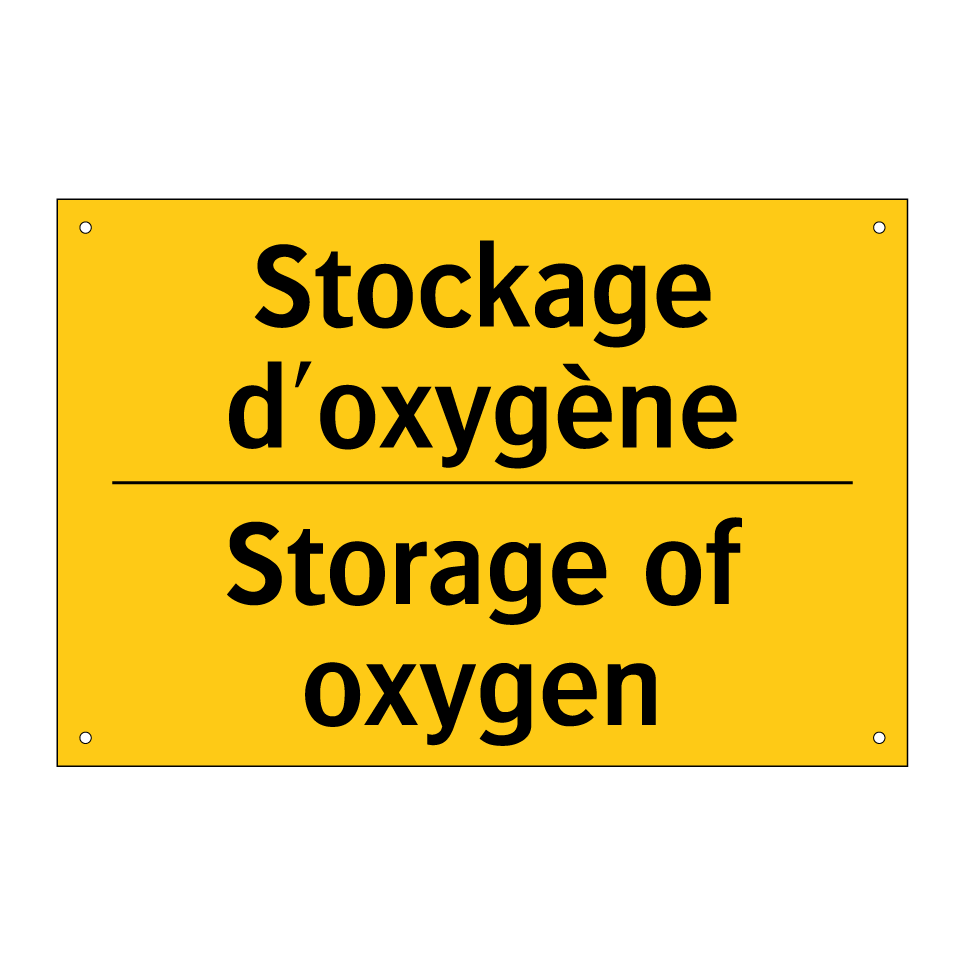 Panneau d'avertissement bilingue avec texte en français : "Stockage d'oxygène", et en anglais : "Storage of oxygen"