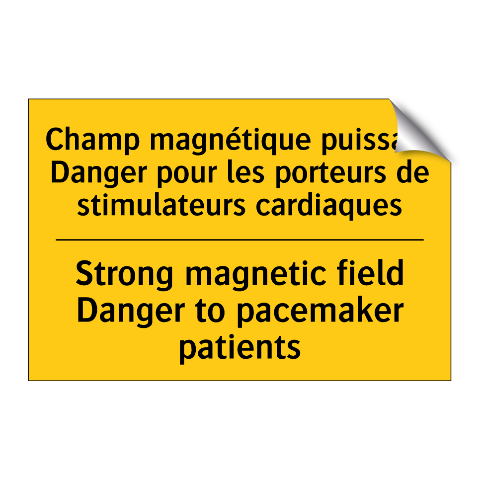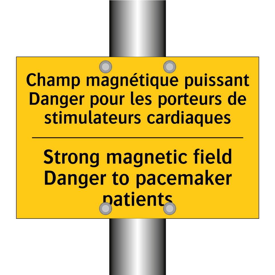 Panneau d'avertissement bilingue avec texte en français : "Champ magnétique puissant Danger pour les porteurs de stimulateurs cardiaques", et en anglais : "Strong magnetic field Danger to pacemaker patients"