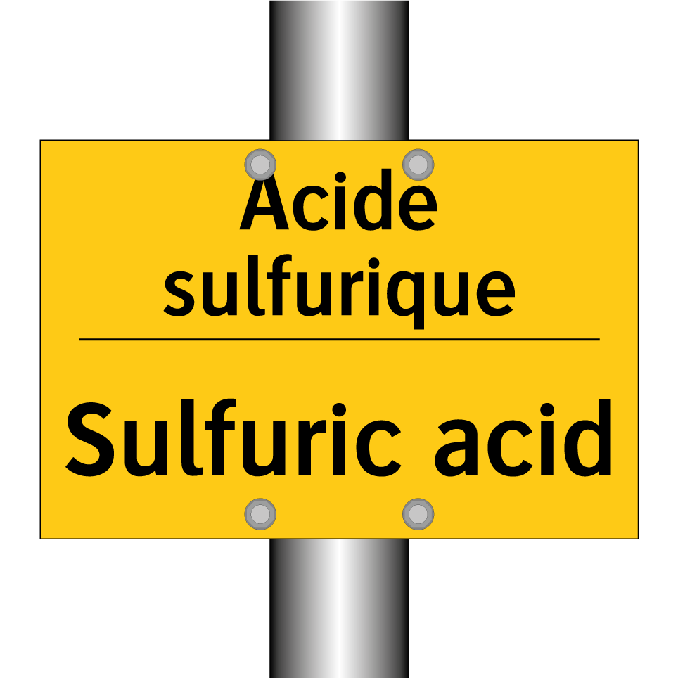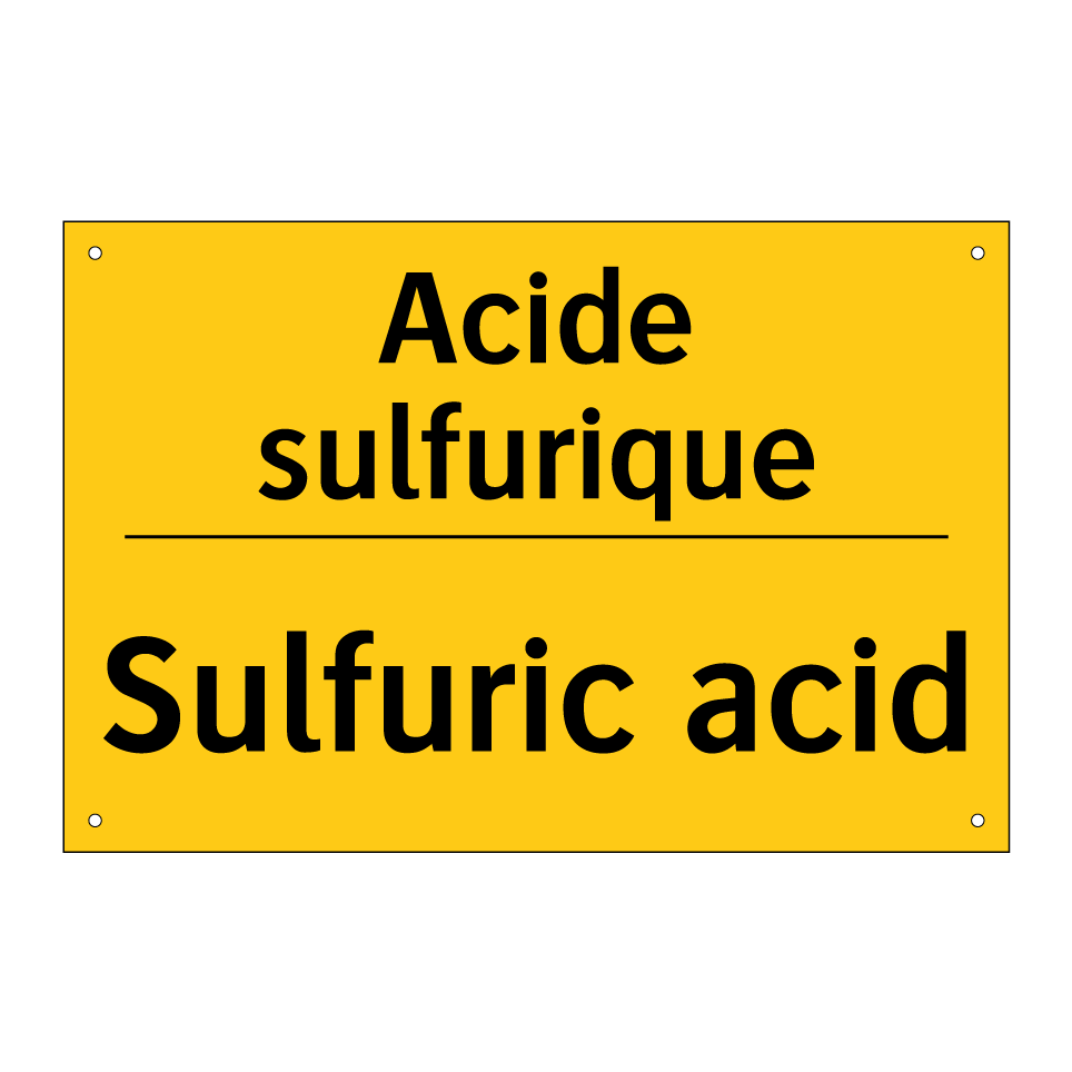 Panneau d'avertissement bilingue avec texte en français : "Acide sulfurique", et en anglais : "Sulfuric acid"