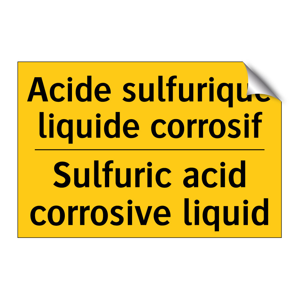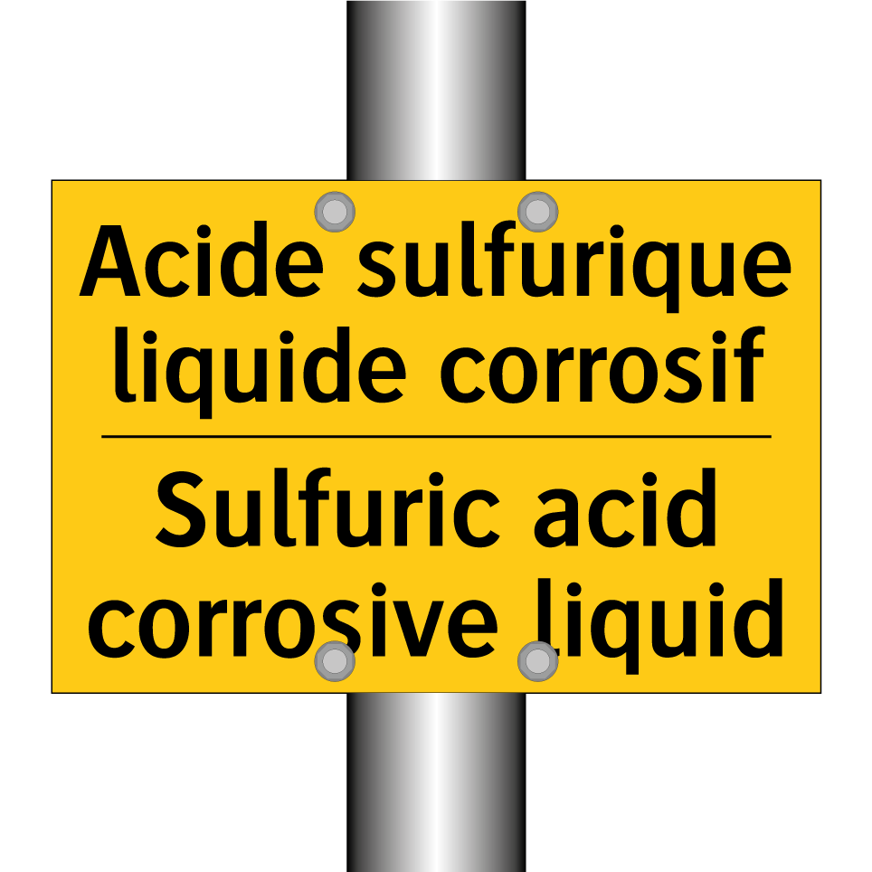 Panneau d'avertissement bilingue avec texte en français : "Acide sulfurique liquide corrosif", et en anglais : "Sulfuric acid corrosive liquid"