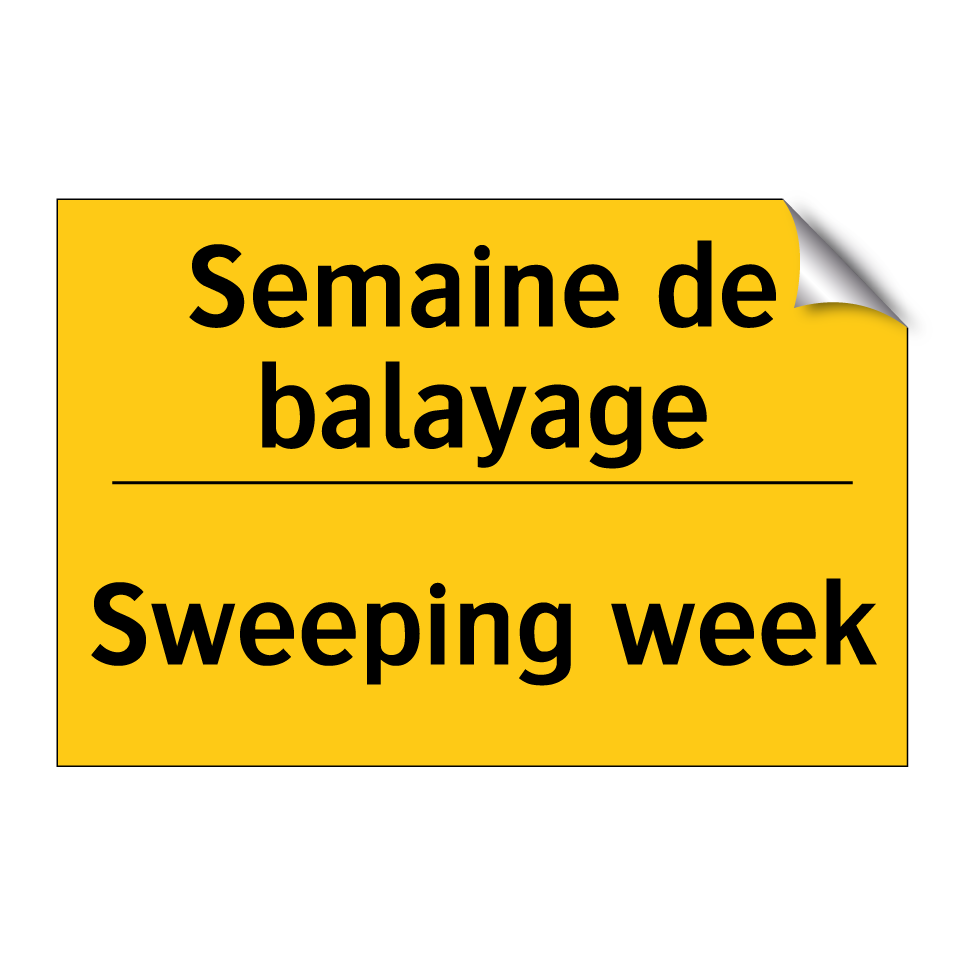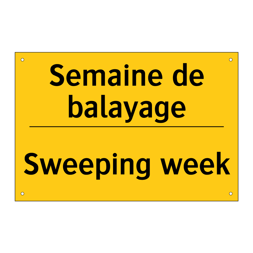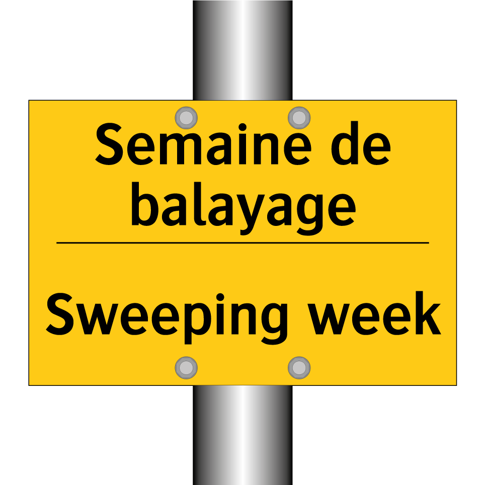 Panneau d'avertissement bilingue avec texte en français : "Semaine de balayage", et en anglais : "Sweeping week"
