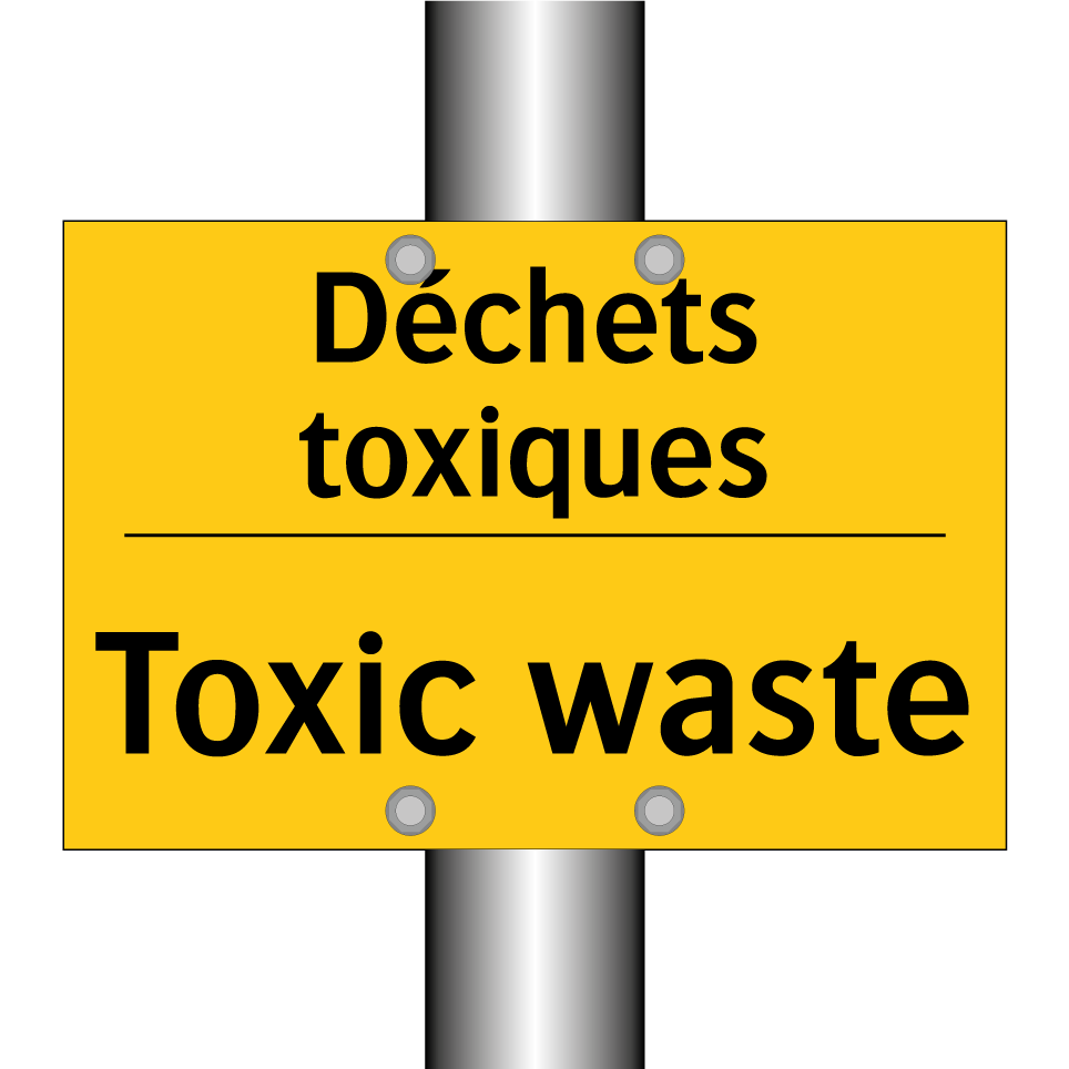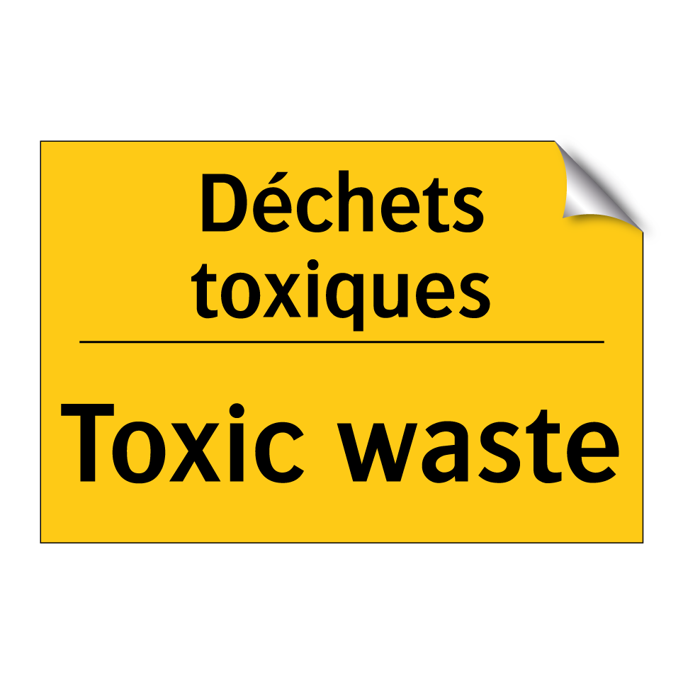 Panneau d'avertissement bilingue avec texte en français : "Déchets toxiques", et en anglais : "Toxic waste"