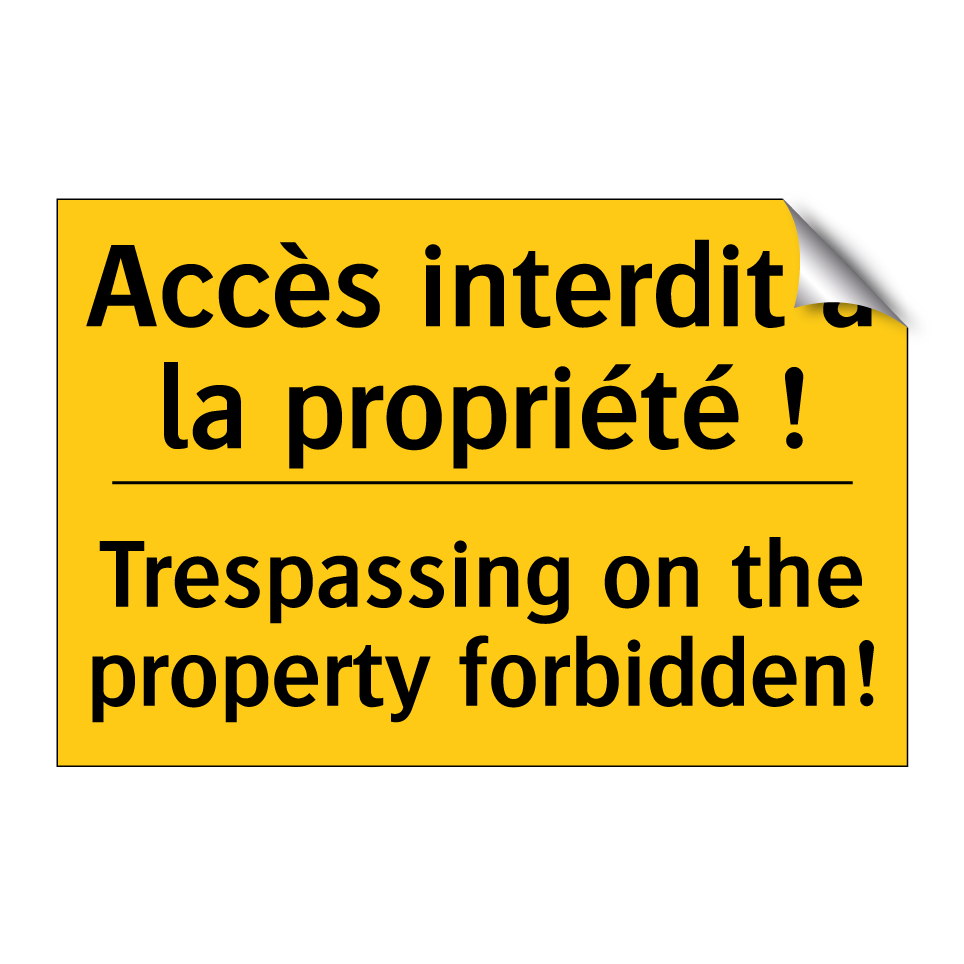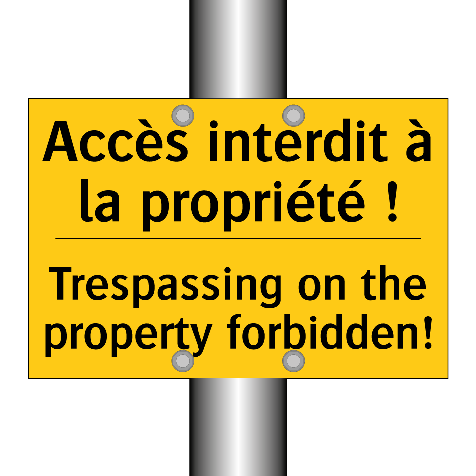 Panneau d'avertissement bilingue avec texte en français : "Accès interdit à la propriété !", et en anglais : "Trespassing on the property forbidden!"