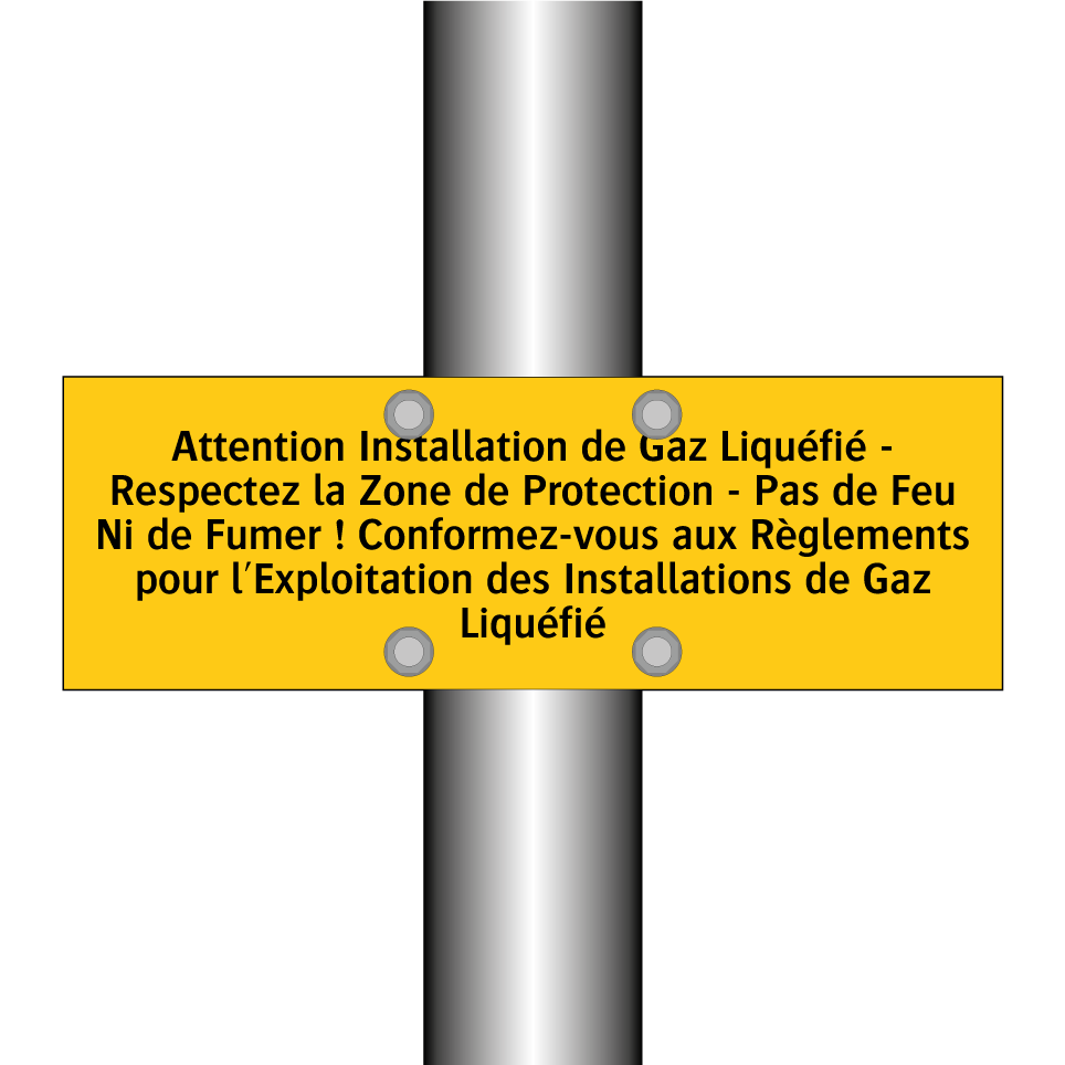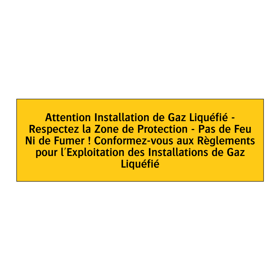Panneau d'avertissement avec le texte : "Attention Installation de Gaz Liquéfié - Respectez la Zone de Protection - Pas de Feu Ni de Fumer ! Conformez-vous aux Règlements pour l'Exploitation des Installations de Gaz Liquéfié"