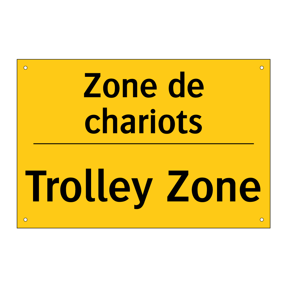Panneau d'avertissement bilingue avec texte en français : "Zone de chariots", et en anglais : "Trolley Zone"