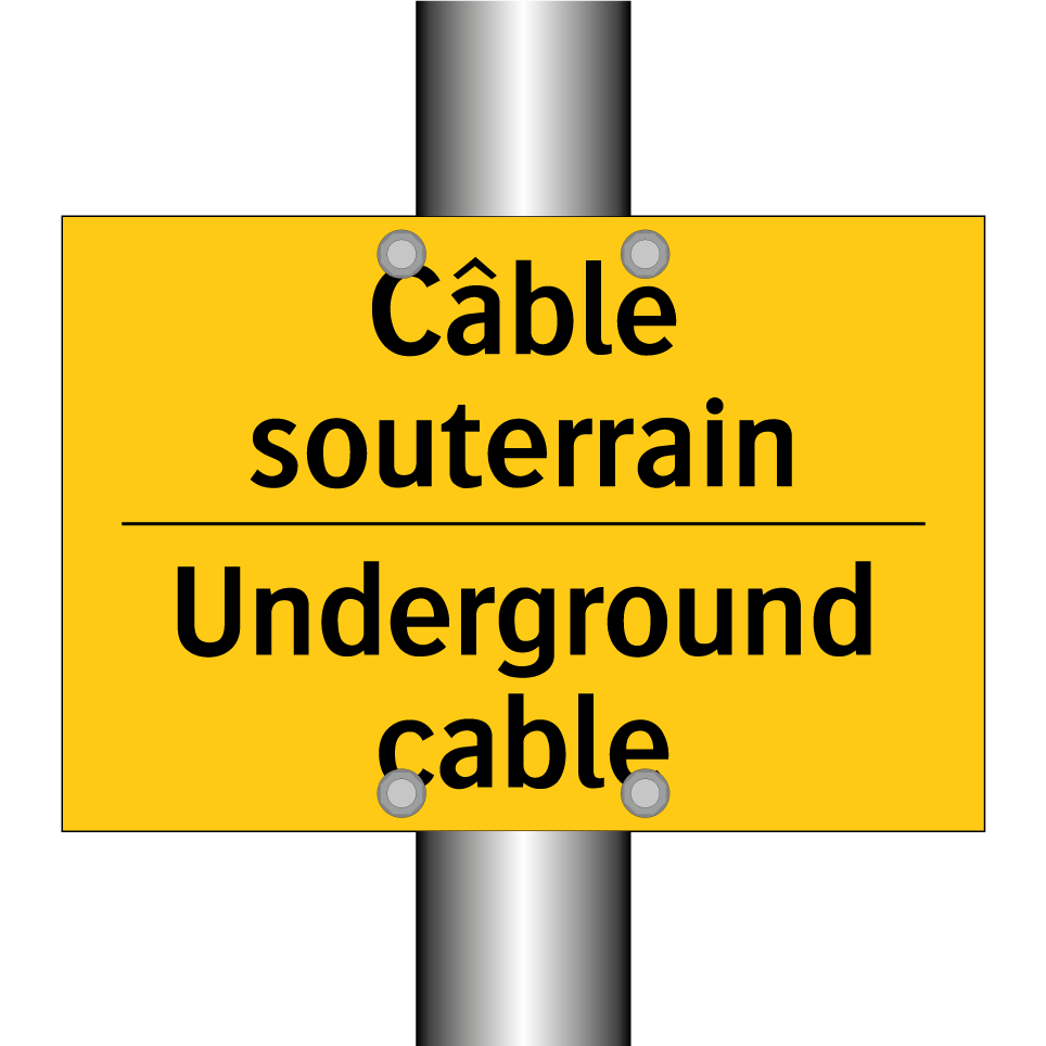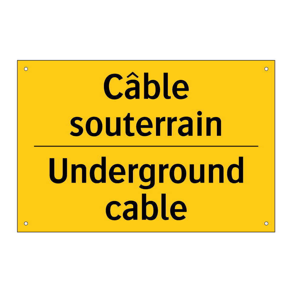 Panneau d'avertissement bilingue avec texte en français : "Câble souterrain", et en anglais : "Underground cable"