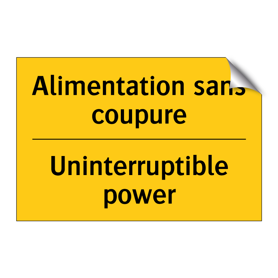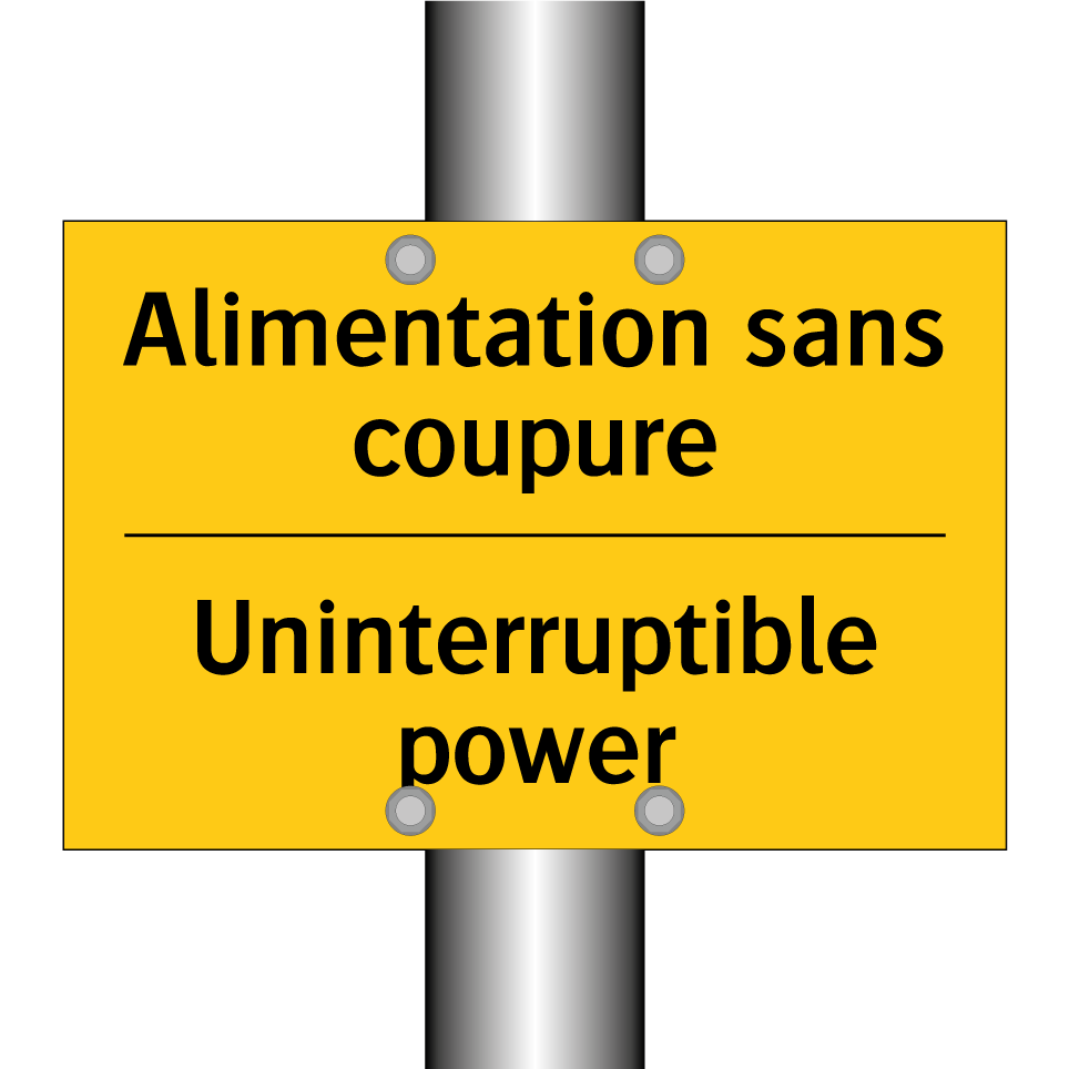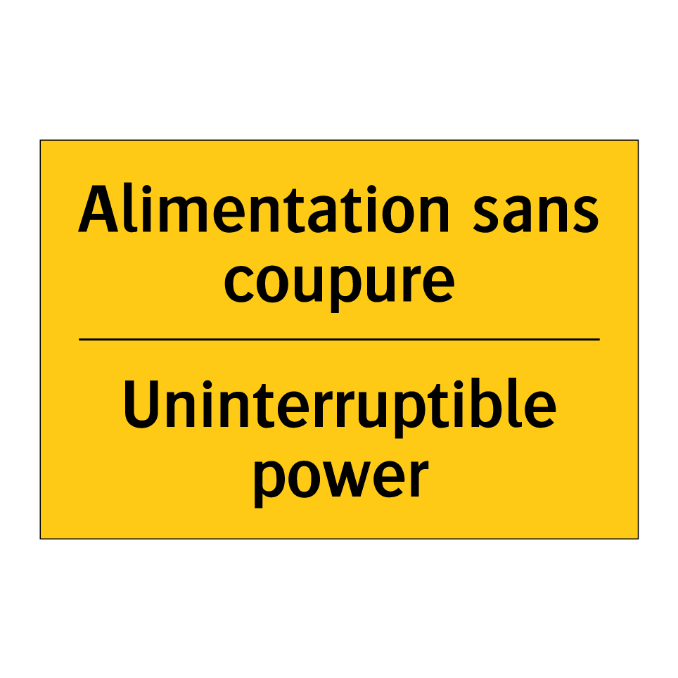 Panneau d'avertissement bilingue avec texte en français : "Alimentation sans coupure", et en anglais : "Uninterruptible power"