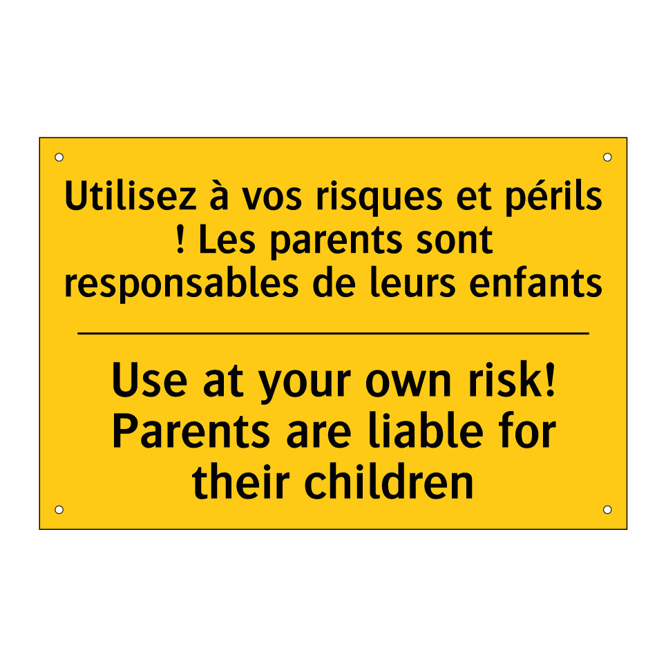 Panneau d'avertissement bilingue avec texte en français : "Utilisez à vos risques et périls ! Les parents sont responsables de leurs enfants", et en anglais : "Use at your own risk! Parents are liable for their children"