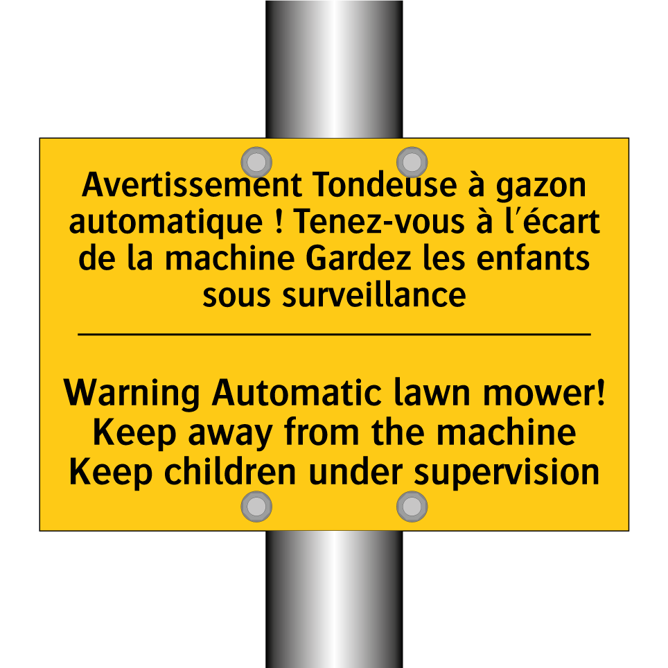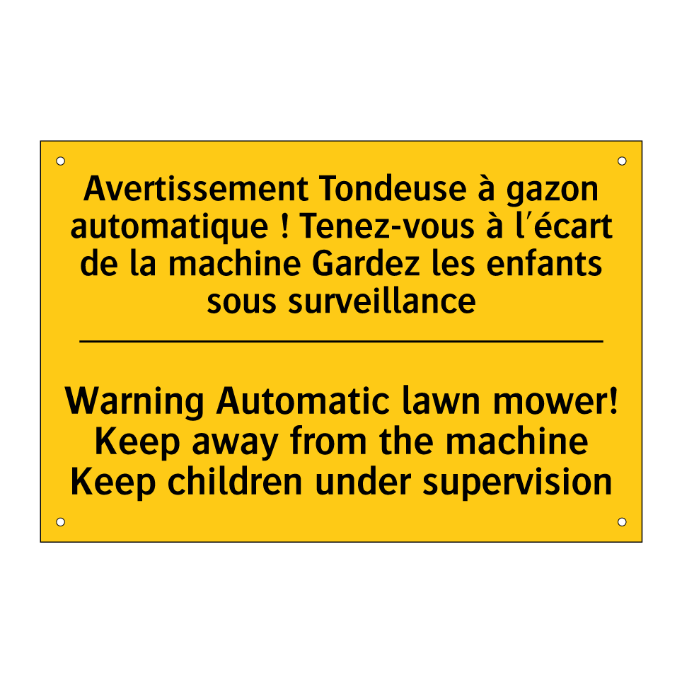 Panneau d'avertissement bilingue avec texte en français : "Avertissement Tondeuse à gazon automatique ! Tenez-vous à l'écart de la machine Gardez les enfants sous surveillance", et en anglais : "Warning Automatic lawn mower! Keep away from the machine Keep children under supervision"