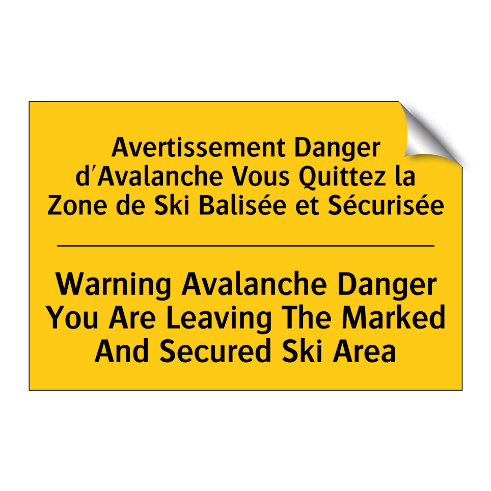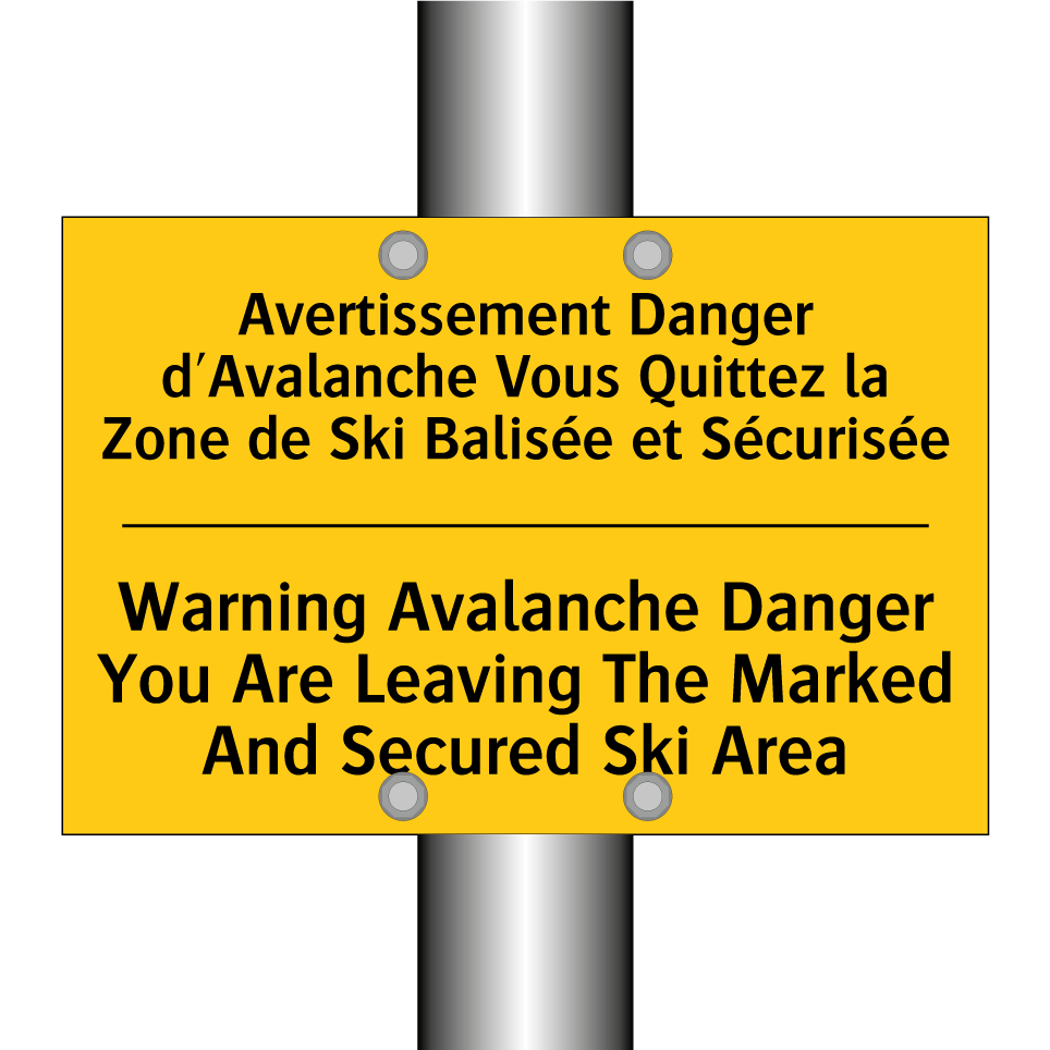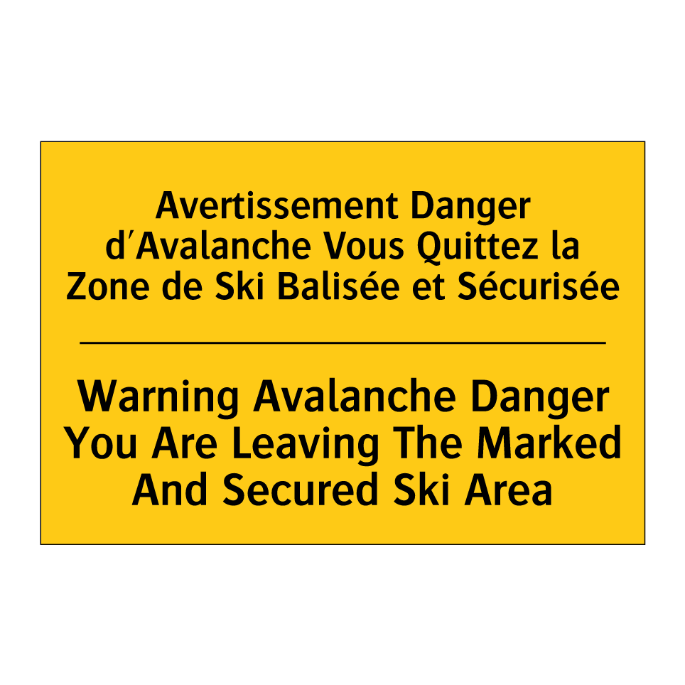 Panneau d'avertissement bilingue avec texte en français : "Avertissement Danger d'Avalanche Vous Quittez la Zone de Ski Balisée et Sécurisée", et en anglais : "Warning Avalanche Danger You Are Leaving The Marked And Secured Ski Area"