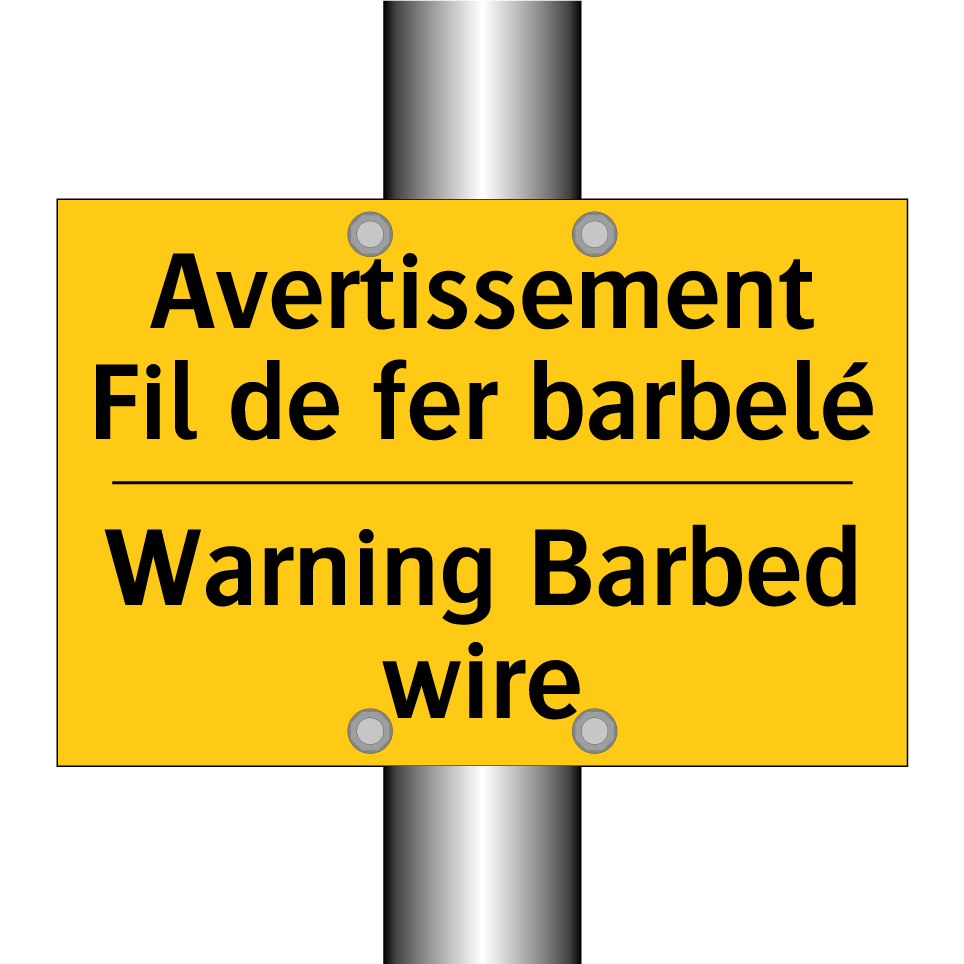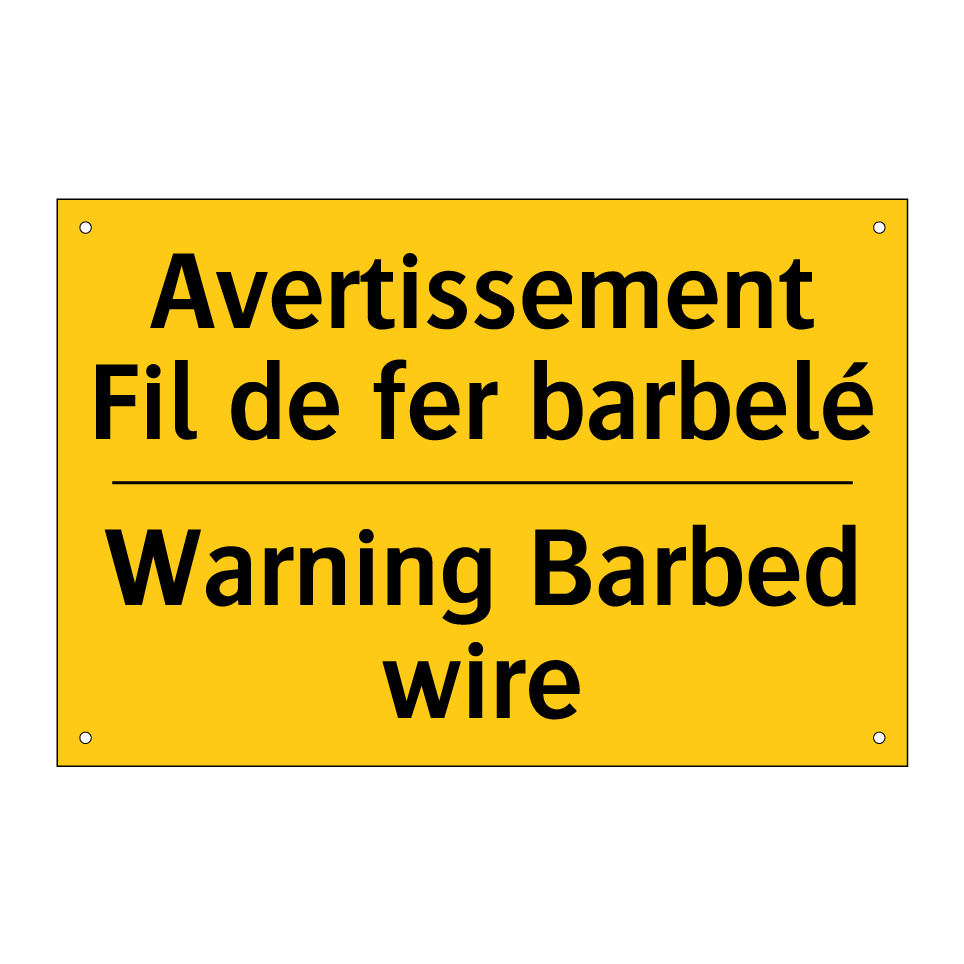 Panneau d'avertissement bilingue avec texte en français : "Avertissement Fil de fer barbelé", et en anglais : "Warning Barbed wire"