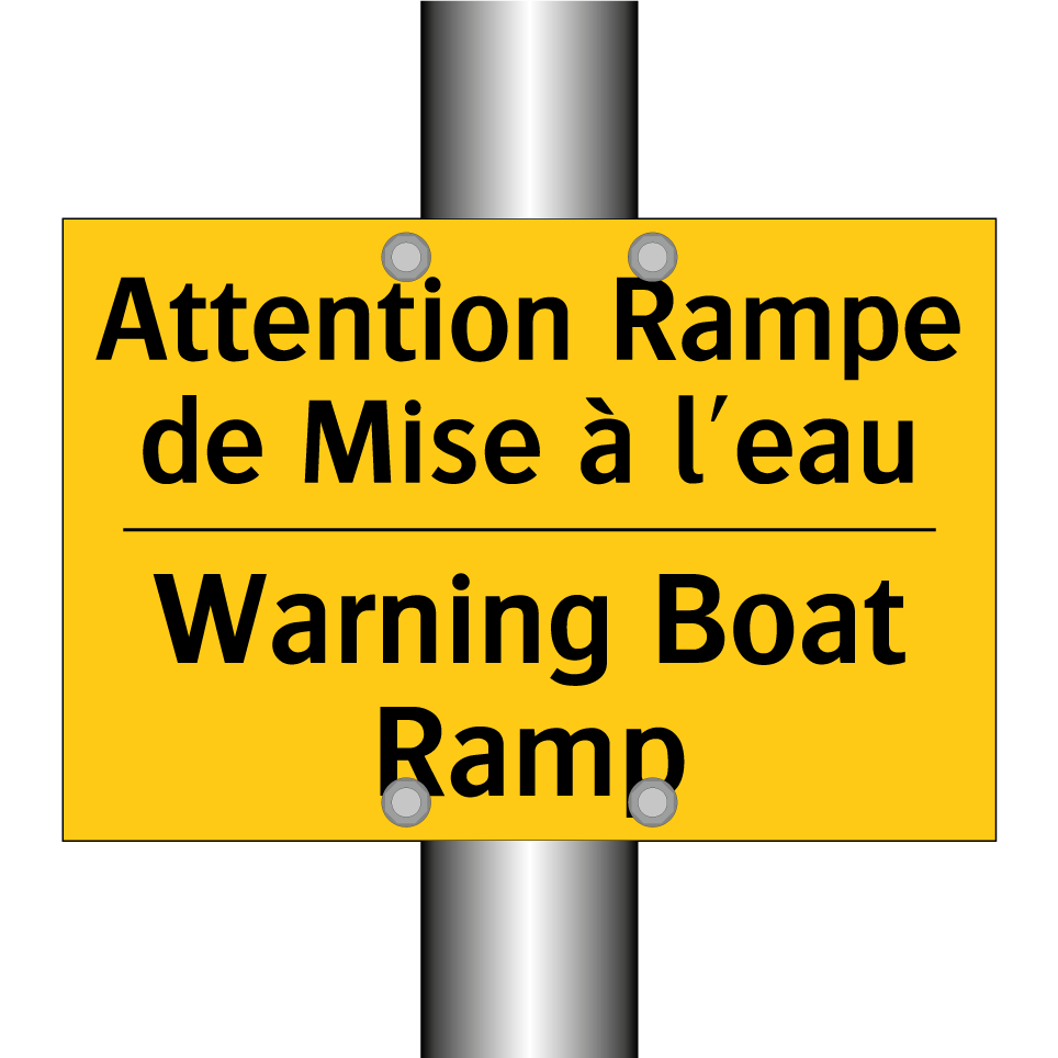 Panneau d'avertissement bilingue avec texte en français : "Attention Rampe de Mise à l'eau", et en anglais : "Warning Boat Ramp"
