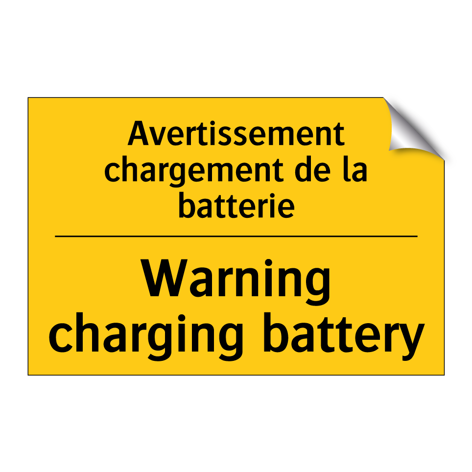 Panneau d'avertissement bilingue avec texte en français : "Avertissement chargement de la batterie", et en anglais : "Warning charging battery"
