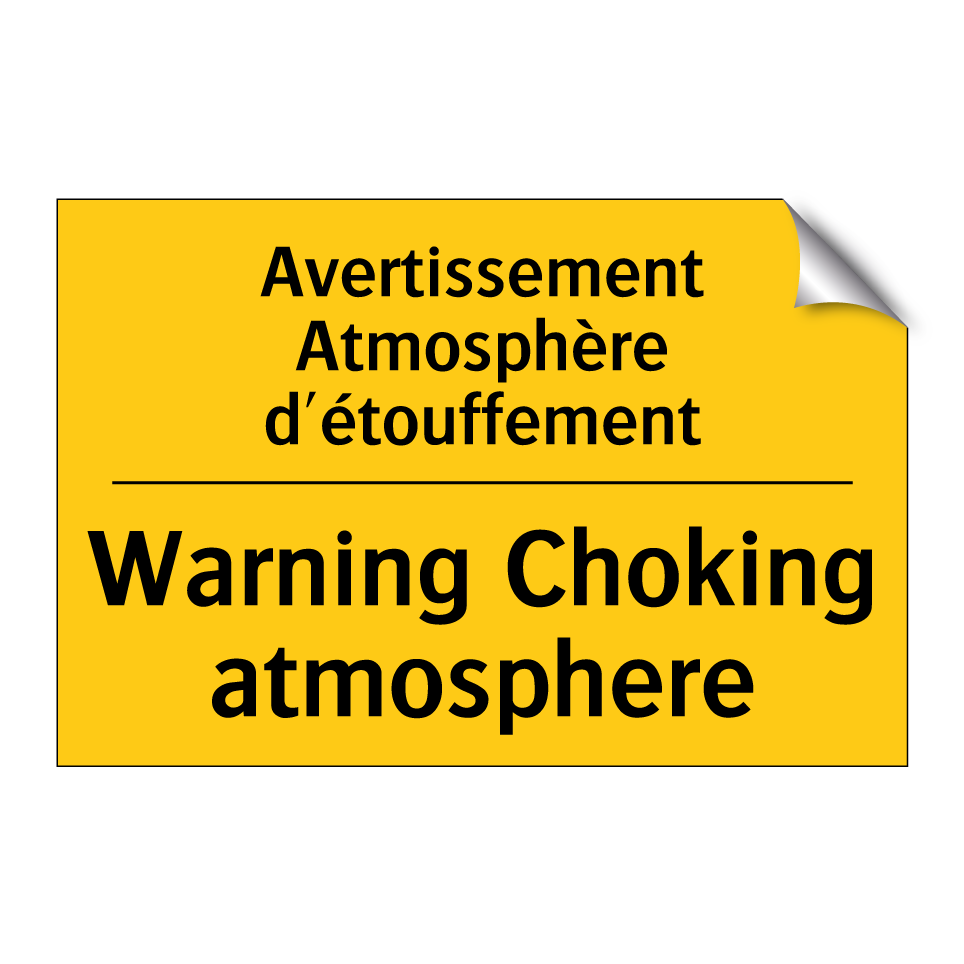 Panneau d'avertissement bilingue avec texte en français : "Avertissement Atmosphère d'étouffement", et en anglais : "Warning Choking atmosphere"