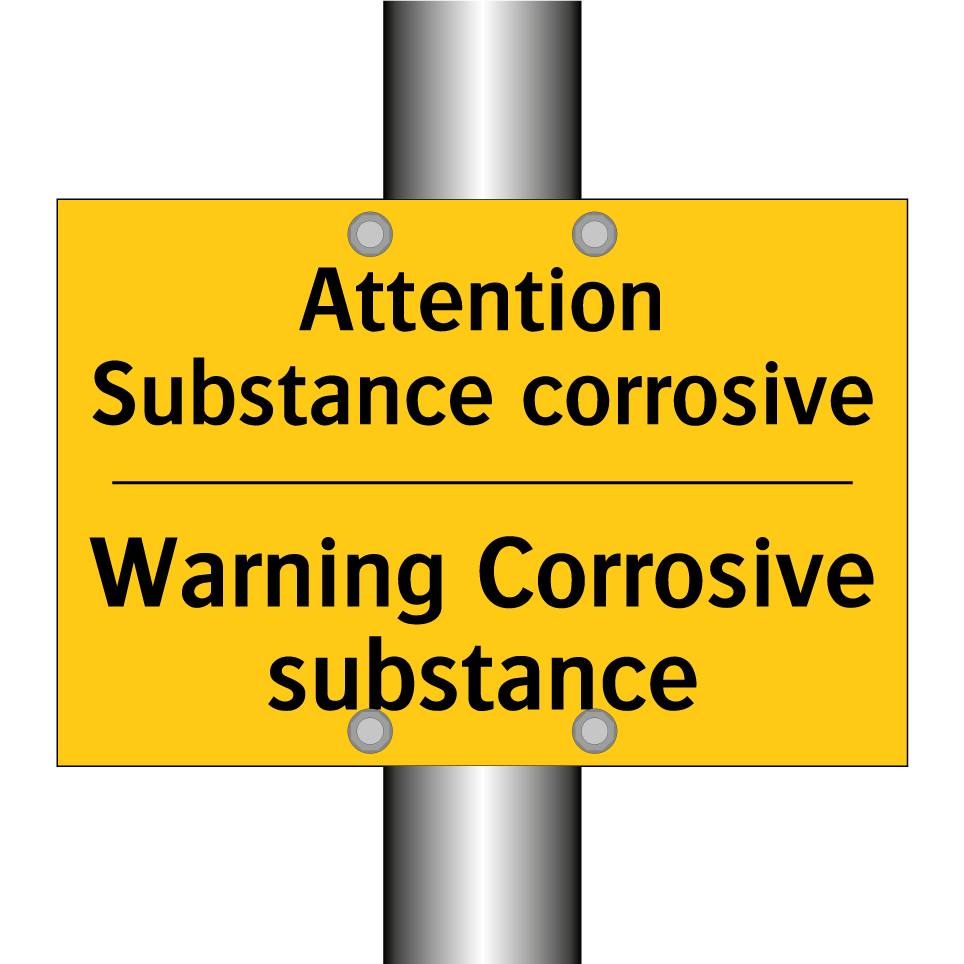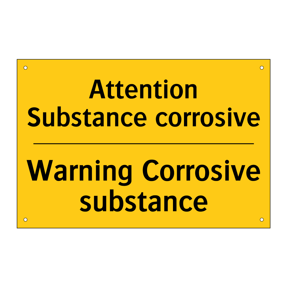 Panneau d'avertissement bilingue avec texte en français : "Attention Substance corrosive", et en anglais : "Warning Corrosive substance"