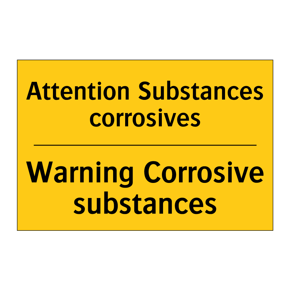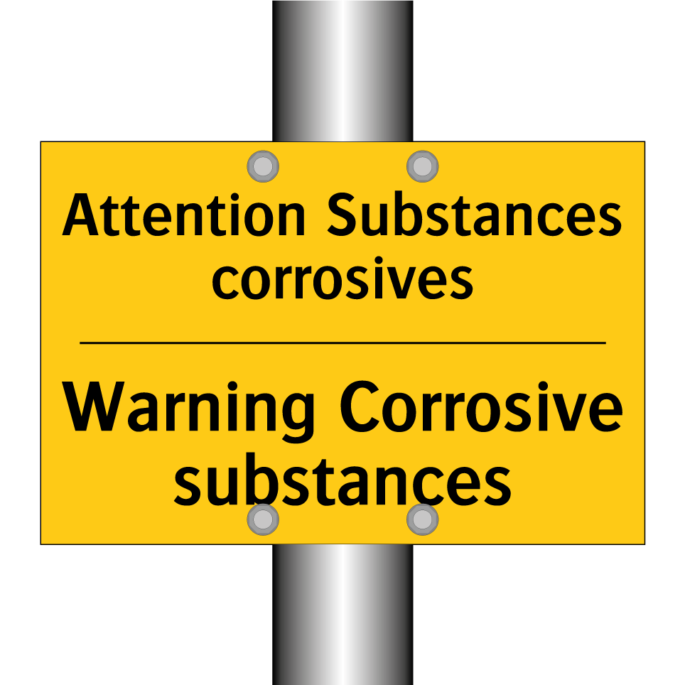 Panneau d'avertissement bilingue avec texte en français : "Attention Substances corrosives", et en anglais : "Warning Corrosive substances"