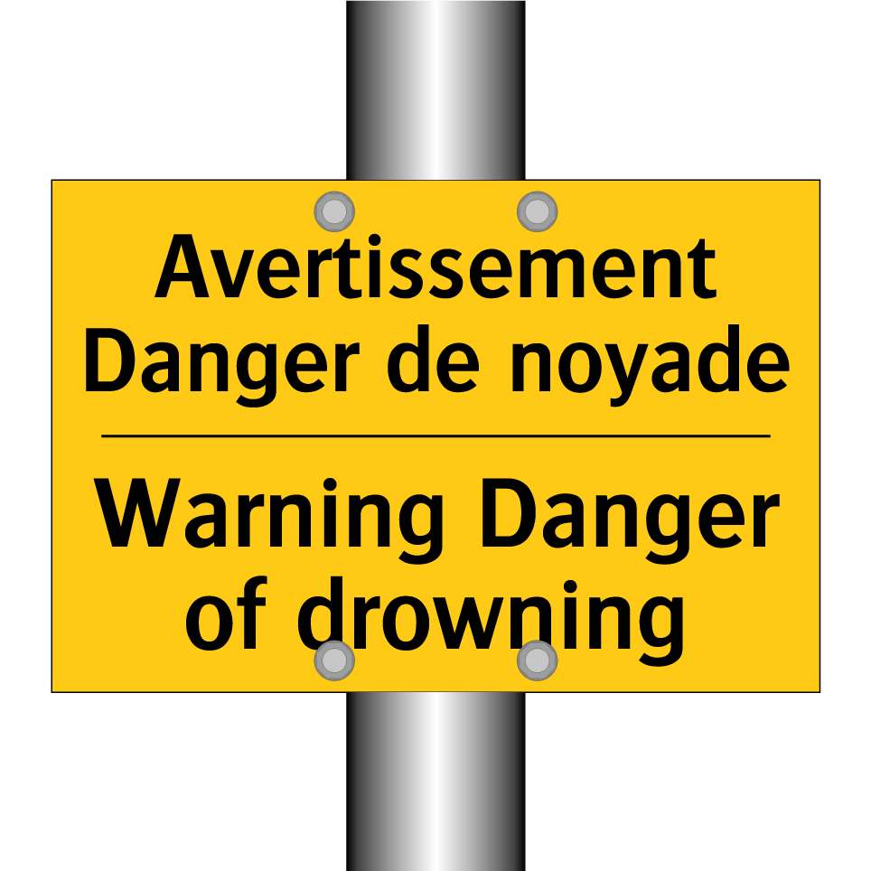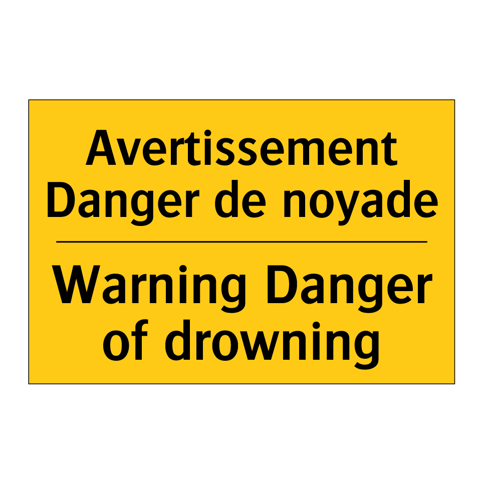 Panneau d'avertissement bilingue avec texte en français : "Avertissement Danger de noyade", et en anglais : "Warning Danger of drowning"
