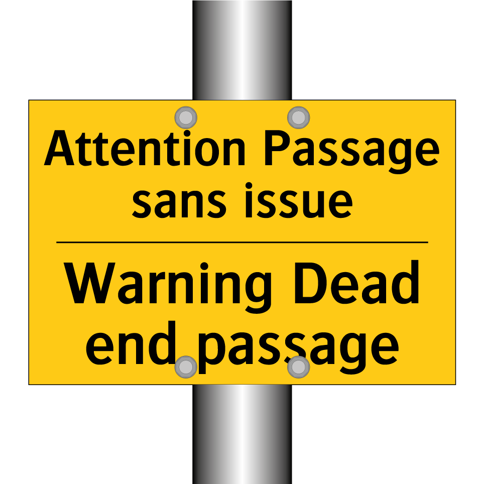 Panneau d'avertissement bilingue avec texte en français : "Attention Passage sans issue", et en anglais : "Warning Dead end passage"