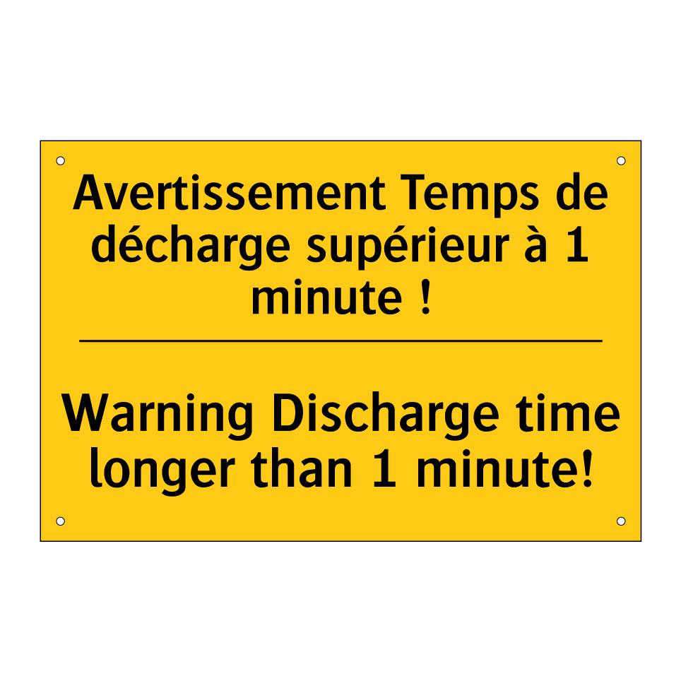 Panneau d'avertissement bilingue avec texte en français : "Avertissement Temps de décharge supérieur à 1 minute !", et en anglais : "Warning Discharge time longer than 1 minute!"