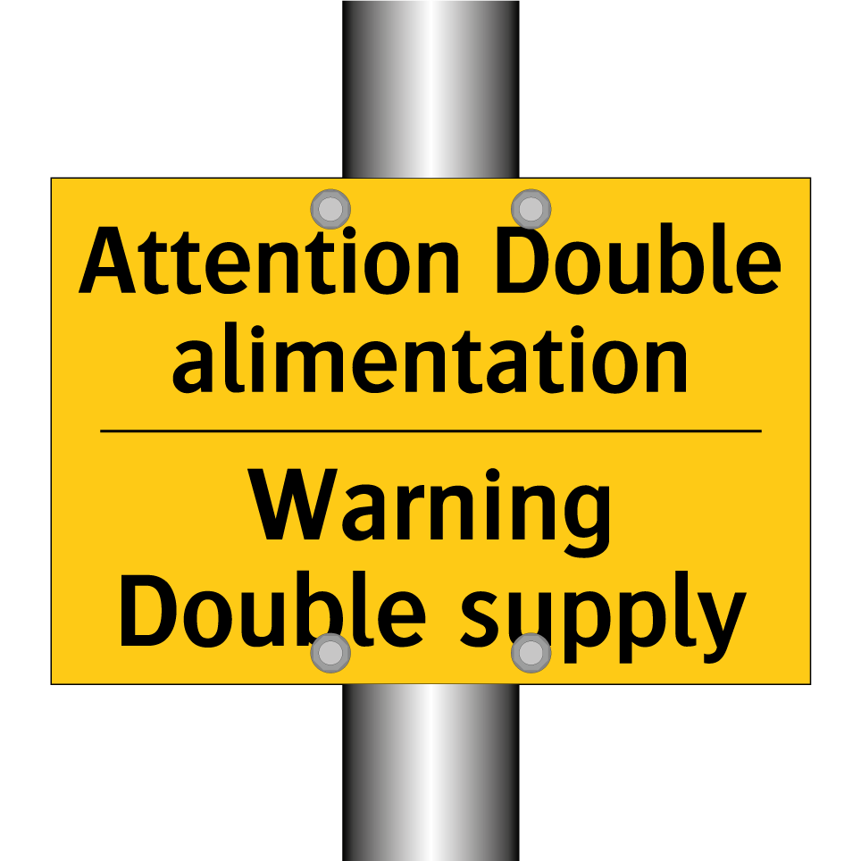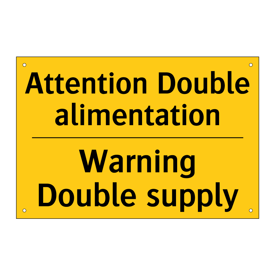 Panneau d'avertissement bilingue avec texte en français : "Attention Double alimentation", et en anglais : "Warning Double supply"