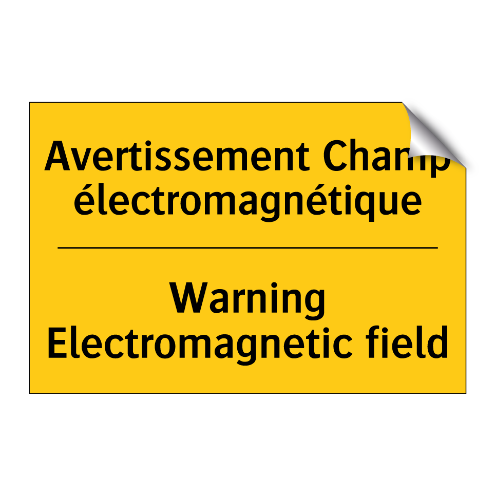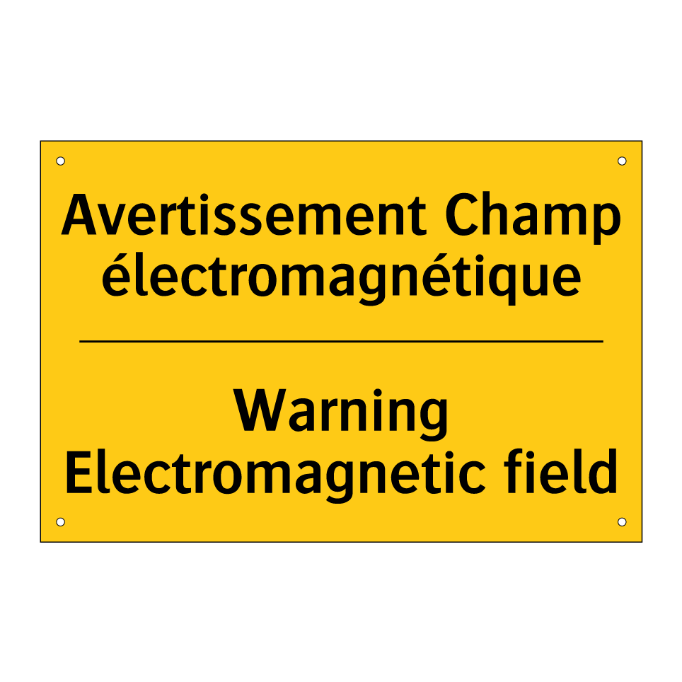 Panneau d'avertissement bilingue avec texte en français : "Avertissement Champ électromagnétique", et en anglais : "Warning Electromagnetic field"