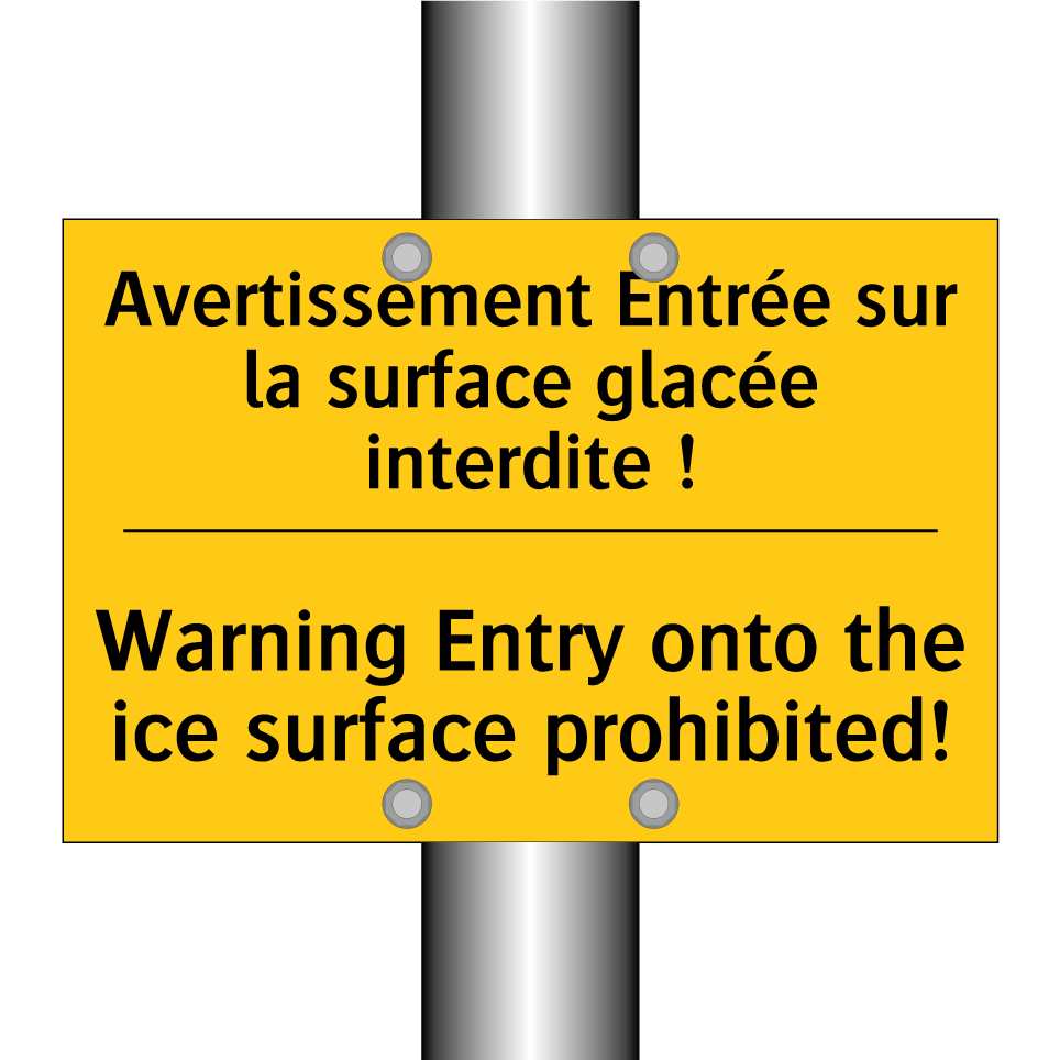 Panneau d'avertissement bilingue avec texte en français : "Avertissement Entrée sur la surface glacée interdite !", et en anglais : "Warning Entry onto the ice surface prohibited!"