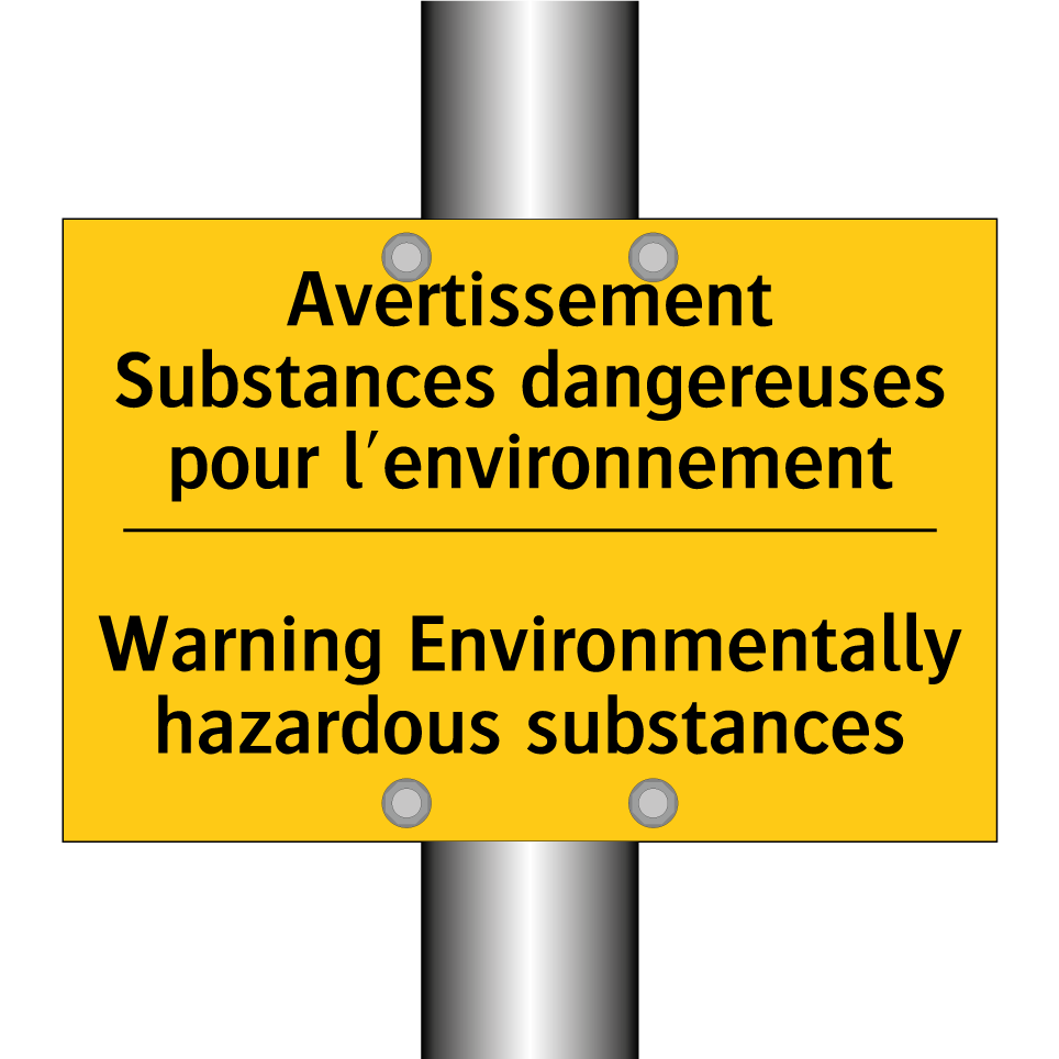 Panneau d'avertissement bilingue avec texte en français : "Avertissement Substances dangereuses pour l'environnement", et en anglais : "Warning Environmentally hazardous substances"