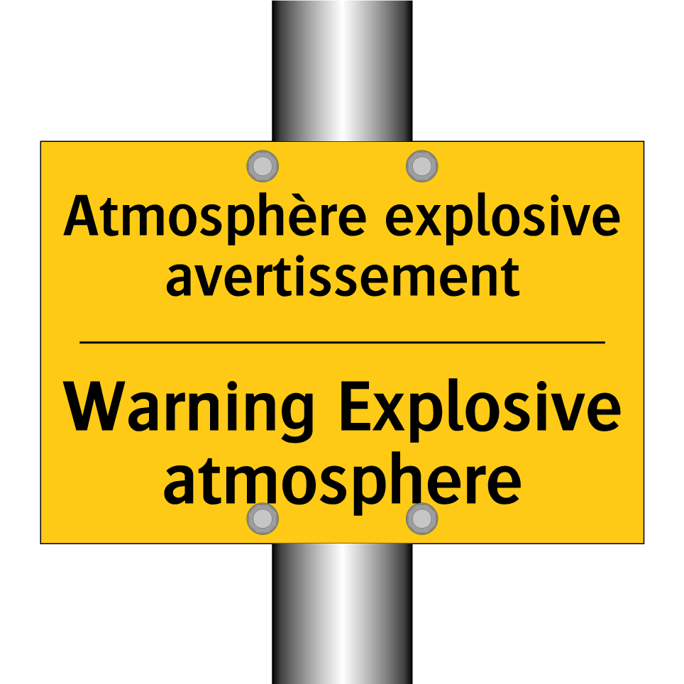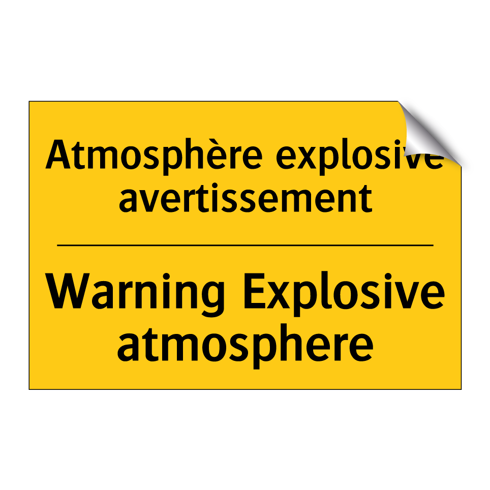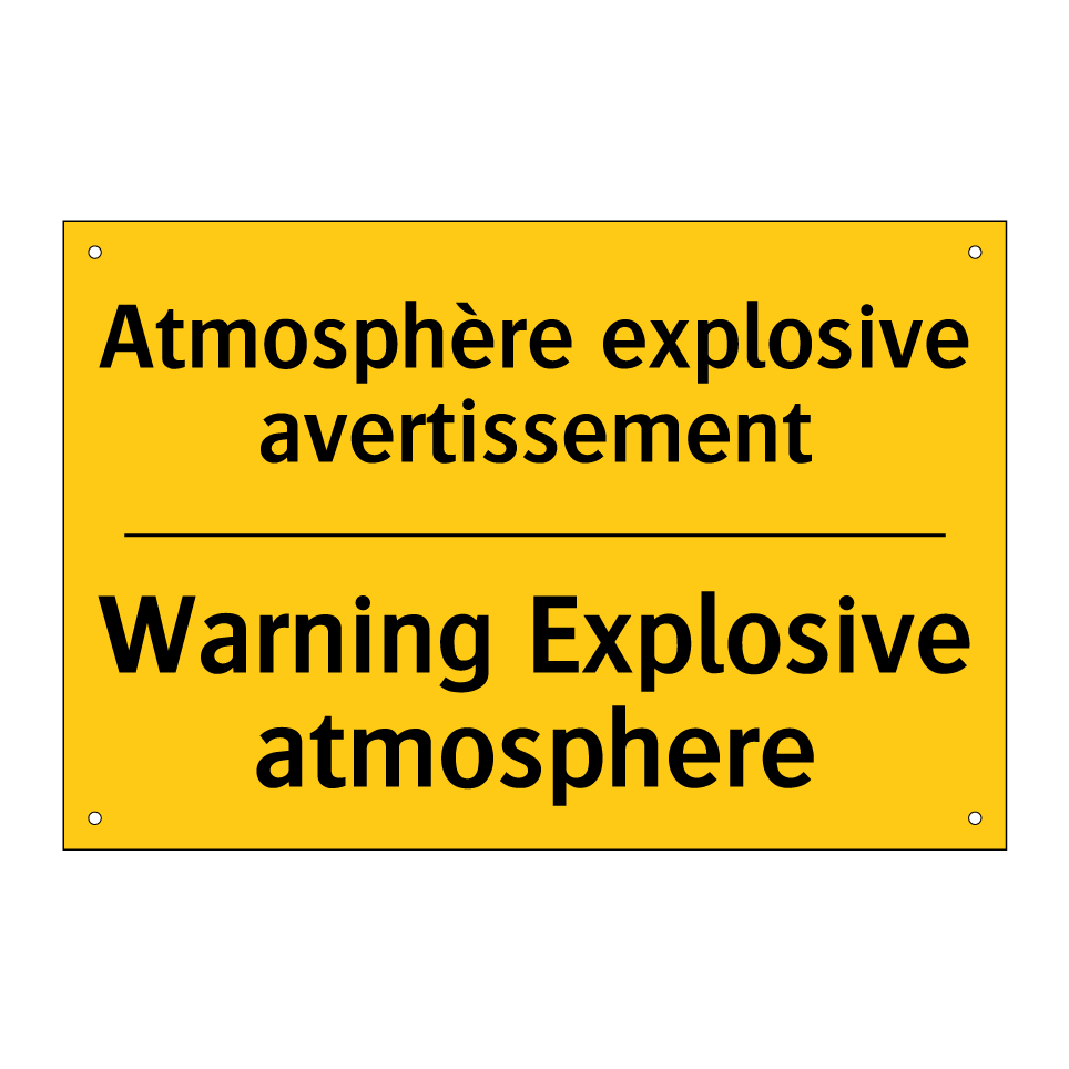 Panneau d'avertissement bilingue avec texte en français : "Atmosphère explosive avertissement", et en anglais : "Warning Explosive atmosphere"