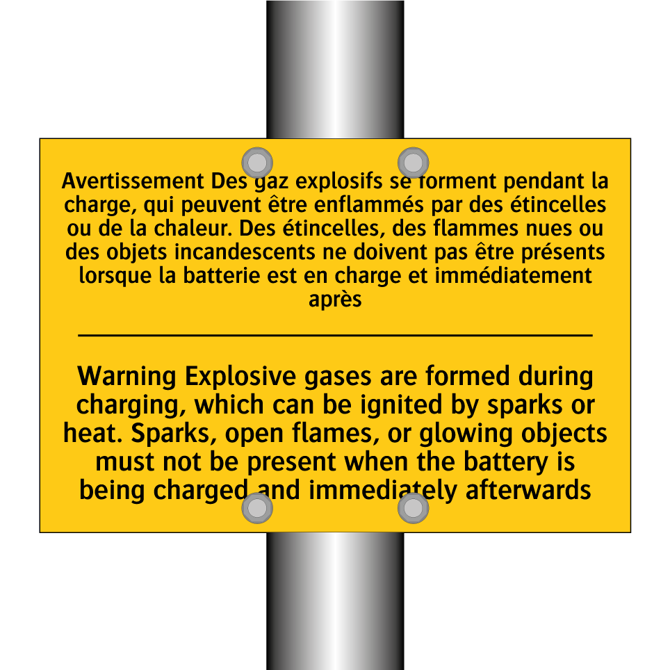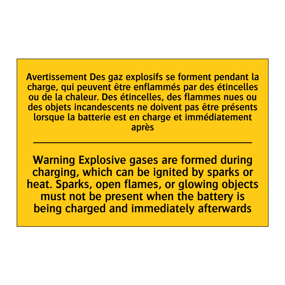 Panneau d'avertissement bilingue avec texte en français : "Avertissement Des gaz explosifs se forment pendant la charge, qui peuvent être enflammés par des étincelles ou de la chaleur. Des étincelles, des flammes nues ou des objets incandescents ne doivent pas être présents lorsque la batterie est en charge et immédiatement après", et en anglais : "Warning Explosive gases are formed during charging, which can be ignited by sparks or heat. Sparks, open flames, or glowing objects must not be present when the battery is being charged and immediately afterwards"