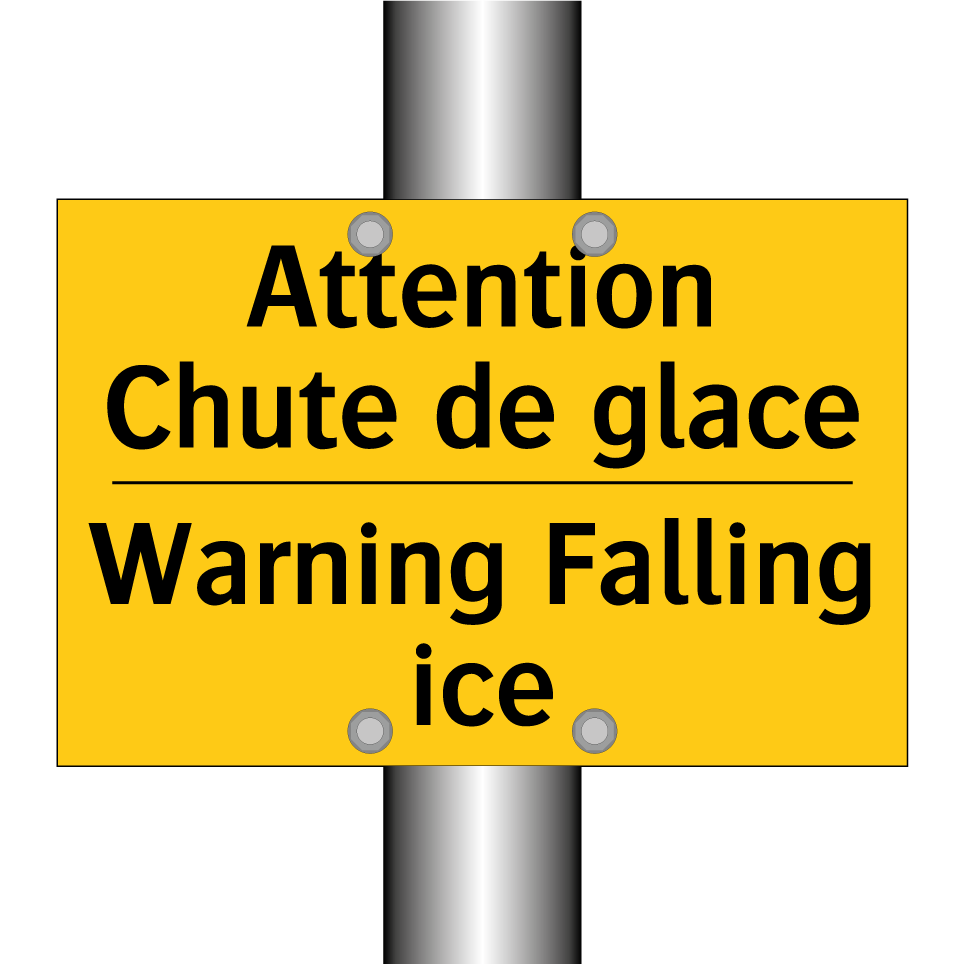 Panneau d'avertissement bilingue avec texte en français : "Attention Chute de glace", et en anglais : "Warning Falling ice"