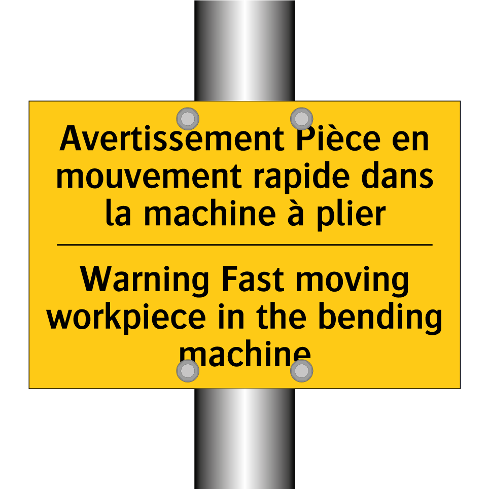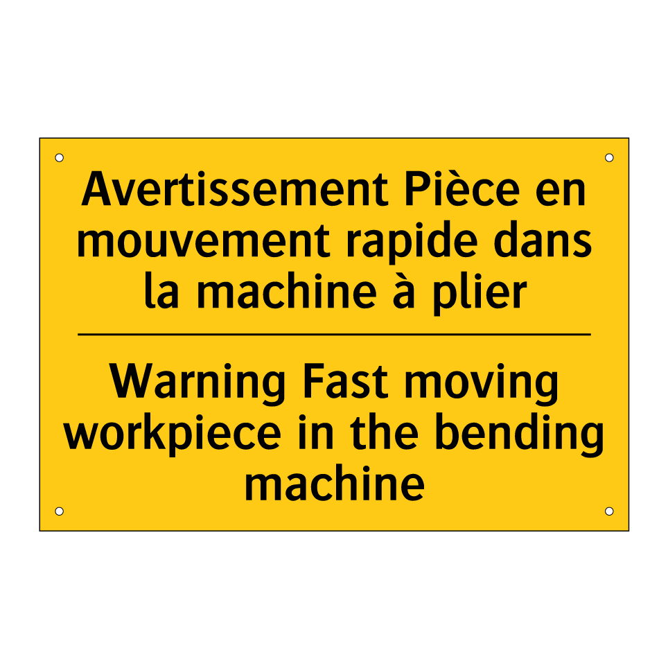 Panneau d'avertissement bilingue avec texte en français : "Avertissement Pièce en mouvement rapide dans la machine à plier", et en anglais : "Warning Fast moving workpiece in the bending machine"
