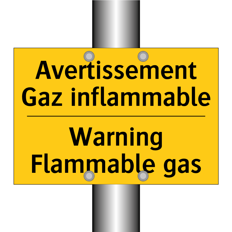 Panneau d'avertissement bilingue avec texte en français : "Avertissement Gaz inflammable", et en anglais : "Warning Flammable gas"
