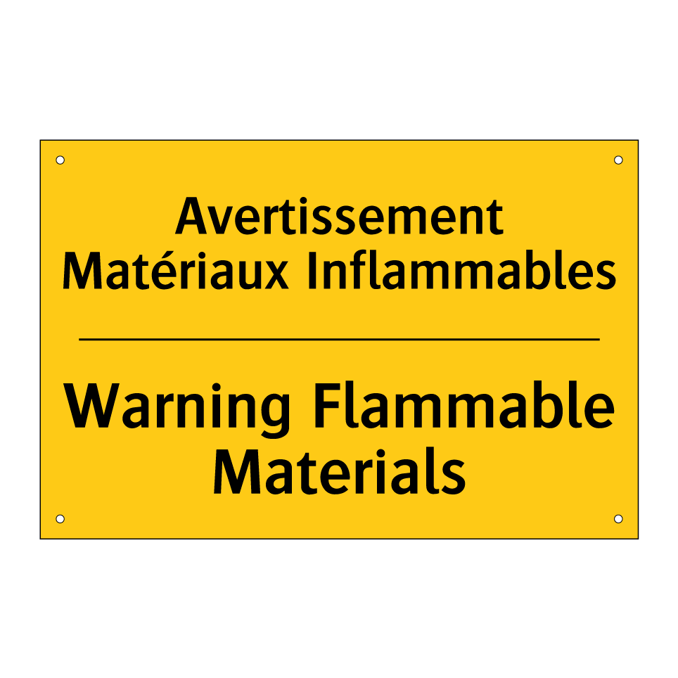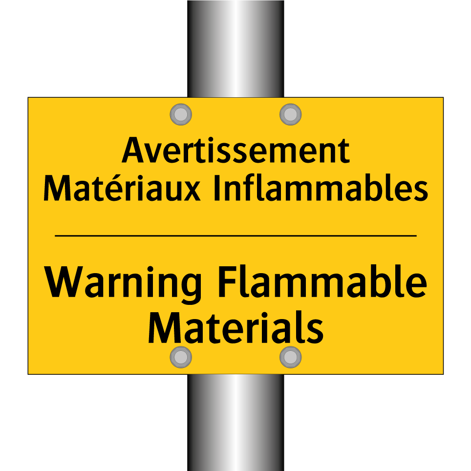 Panneau d'avertissement bilingue avec texte en français : "Avertissement Matériaux Inflammables", et en anglais : "Warning Flammable Materials"