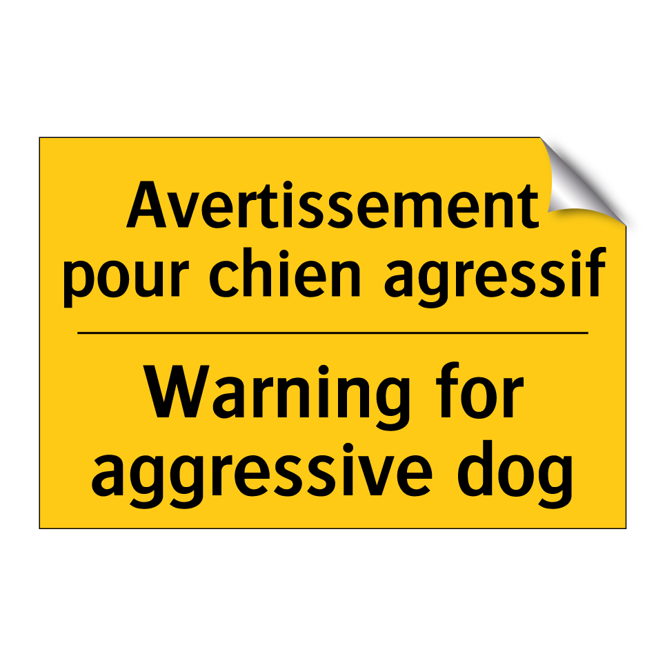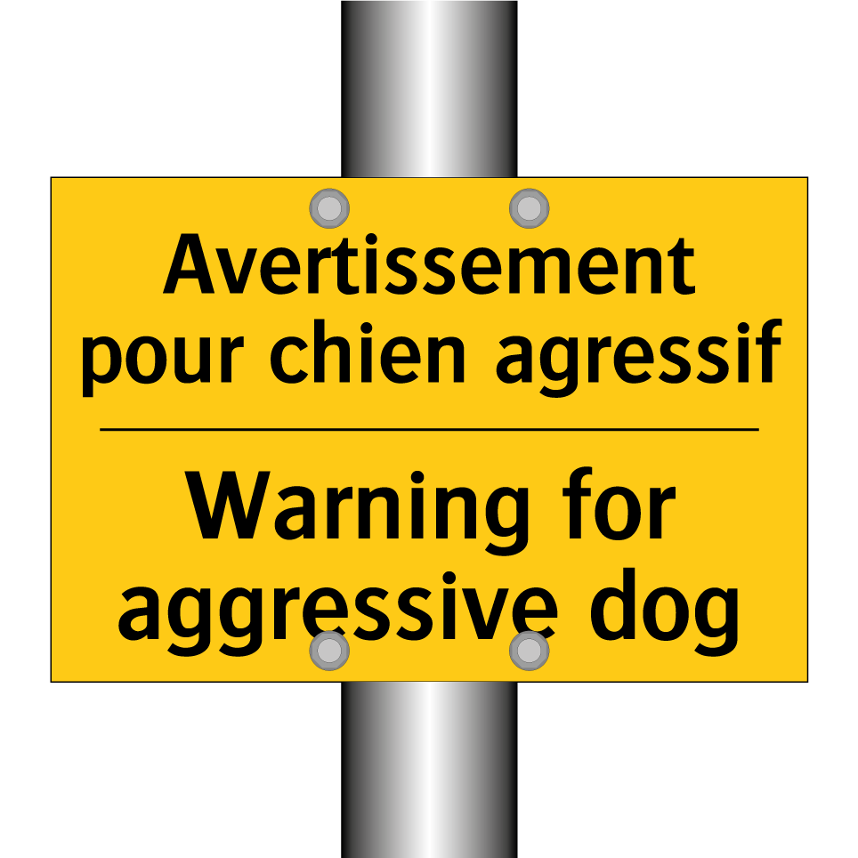 Panneau d'avertissement bilingue avec texte en français : "Avertissement pour chien agressif", et en anglais : "Warning for aggressive dog"