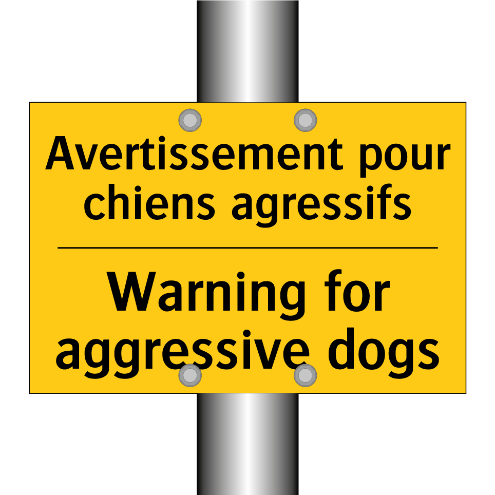 Panneau d'avertissement bilingue avec texte en français : "Avertissement pour chiens agressifs", et en anglais : "Warning for aggressive dogs"