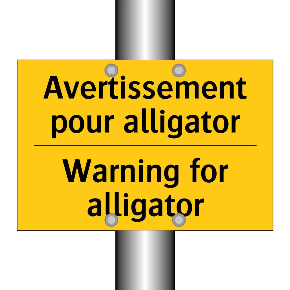 Panneau d'avertissement bilingue avec texte en français : "Avertissement pour alligator", et en anglais : "Warning for alligator"