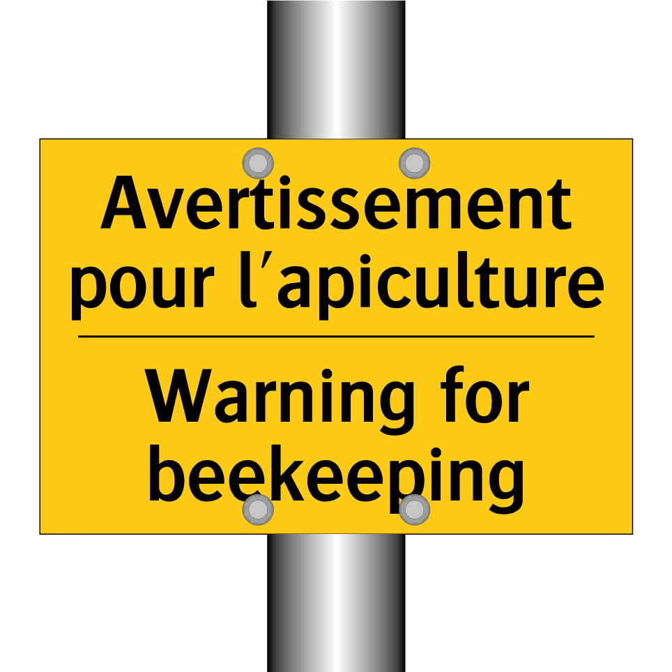 Panneau d'avertissement bilingue avec texte en français : "Avertissement pour l'apiculture", et en anglais : "Warning for beekeeping"
