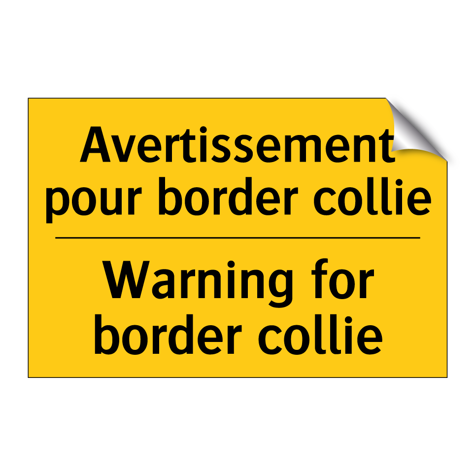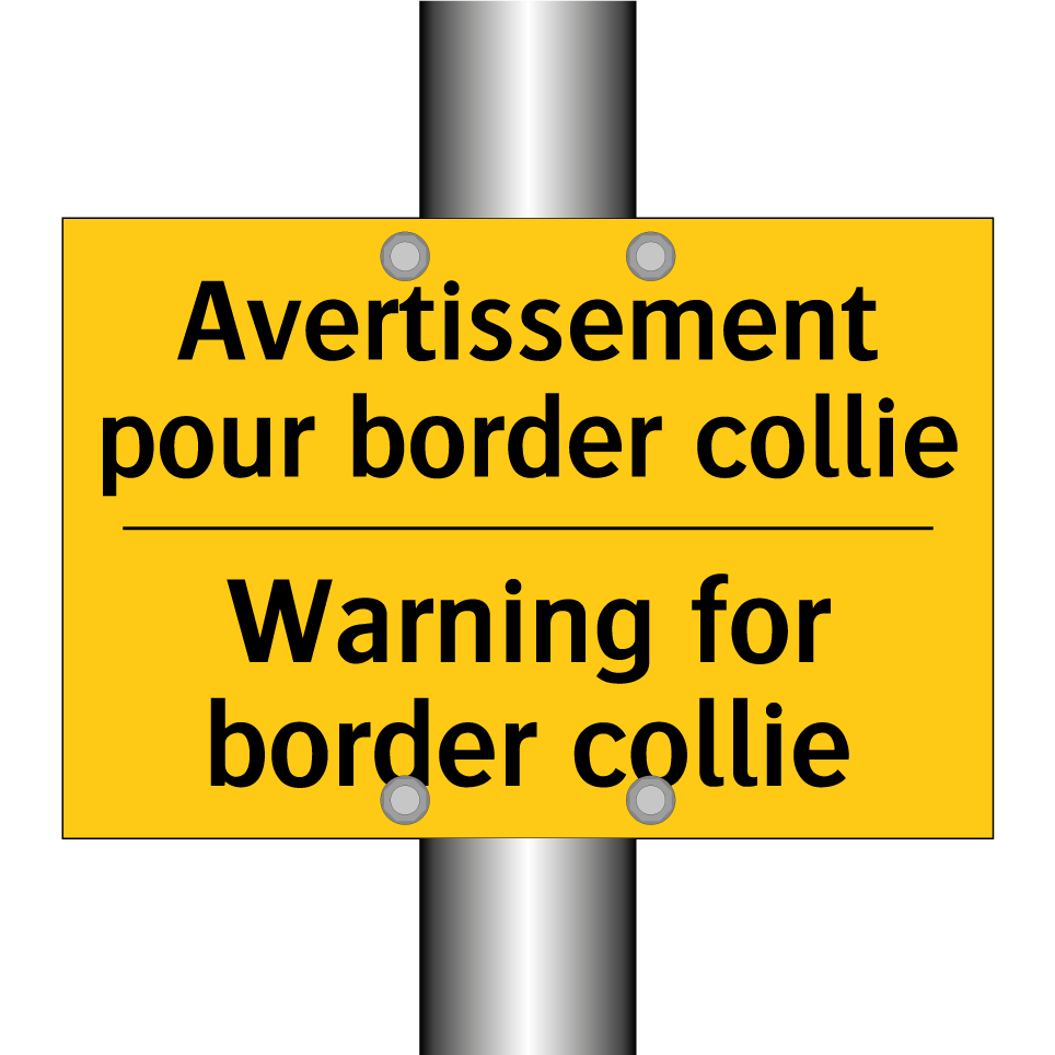 Panneau d'avertissement bilingue avec texte en français : "Avertissement pour border collie", et en anglais : "Warning for border collie"