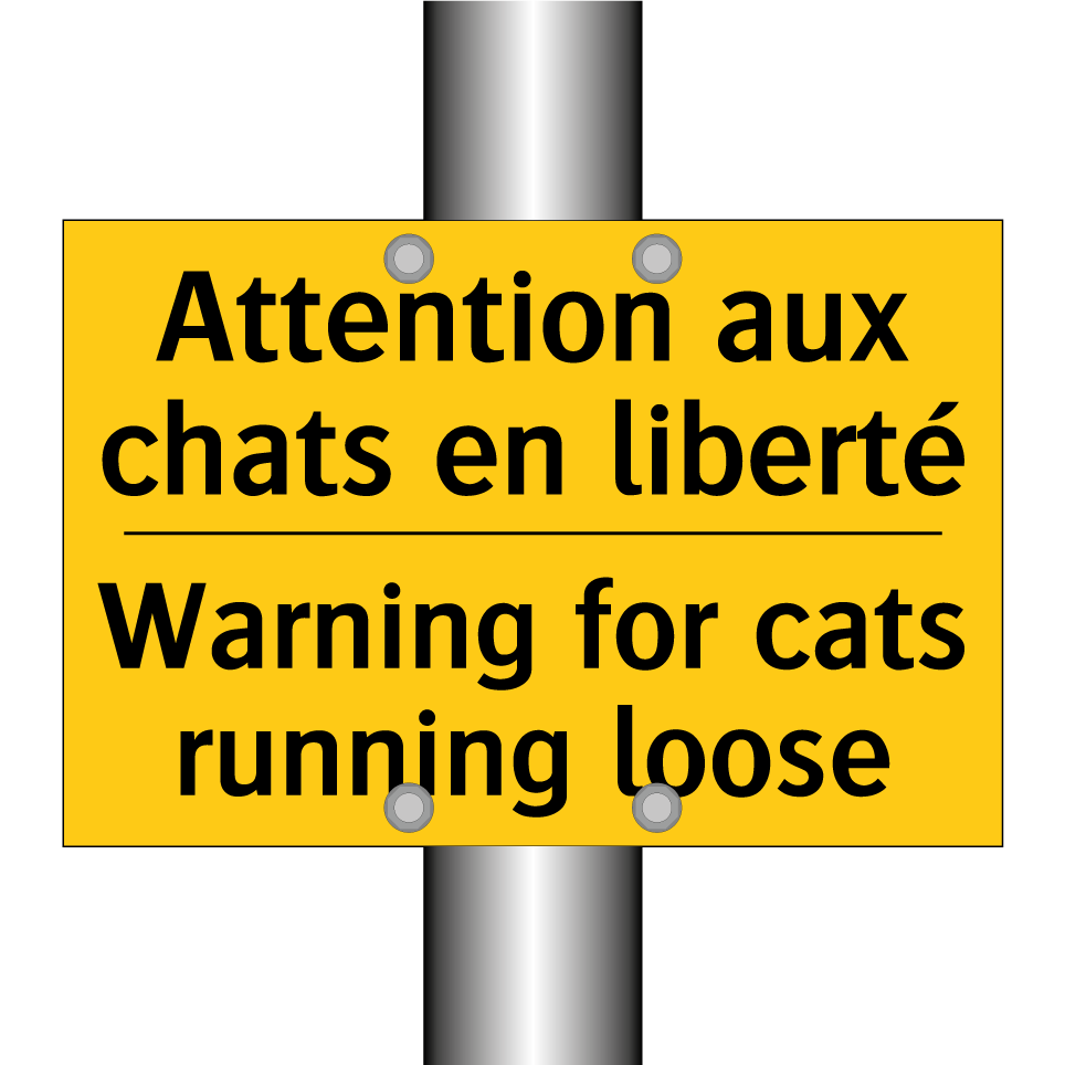 Panneau d'avertissement bilingue avec texte en français : "Attention aux chats en liberté", et en anglais : "Warning for cats running loose"