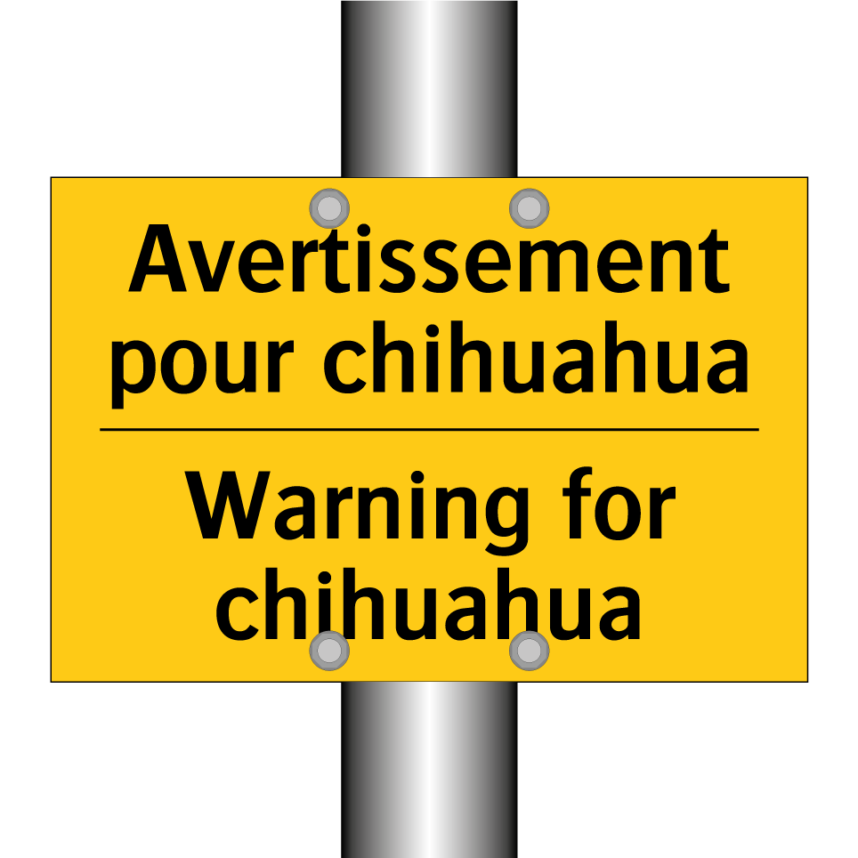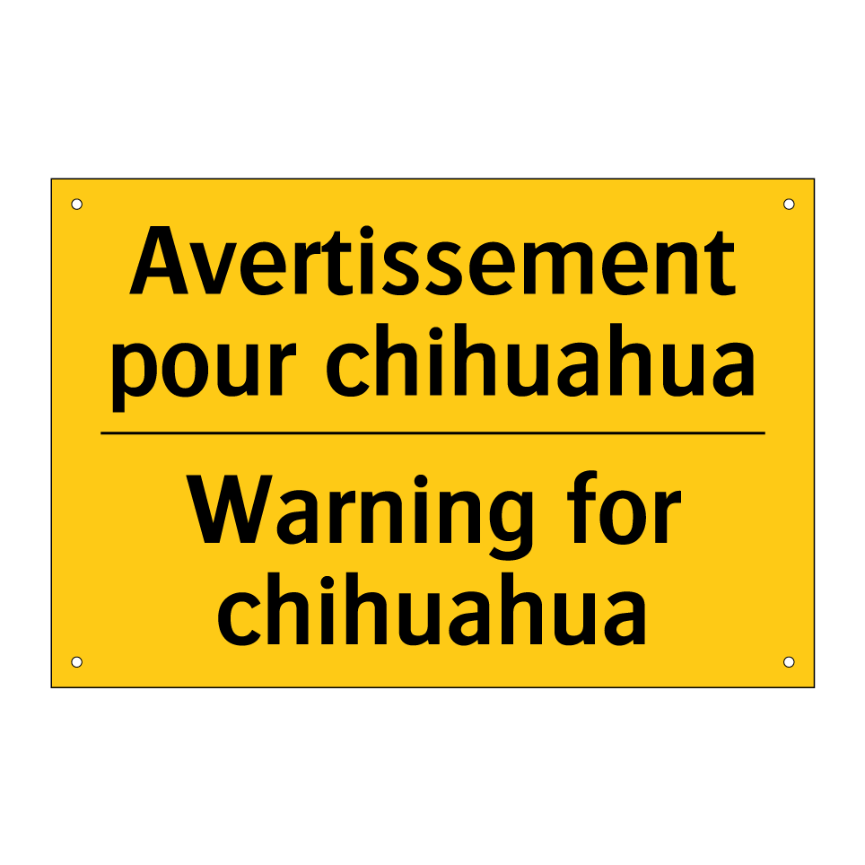 Panneau d'avertissement bilingue avec texte en français : "Avertissement pour chihuahua", et en anglais : "Warning for chihuahua"