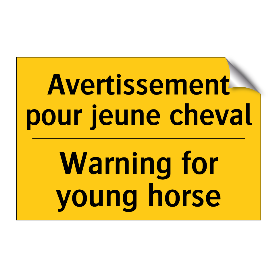 Panneau d'avertissement bilingue avec texte en français : "Avertissement pour jeune cheval", et en anglais : "Warning for young horse"