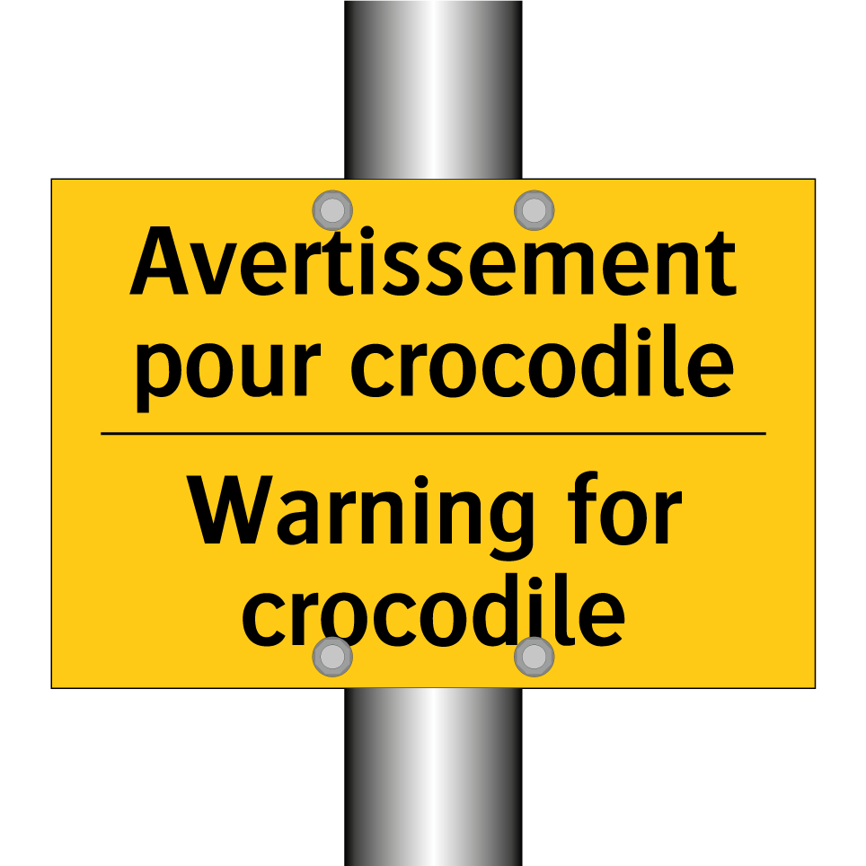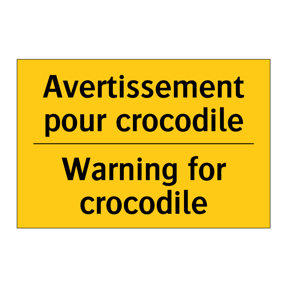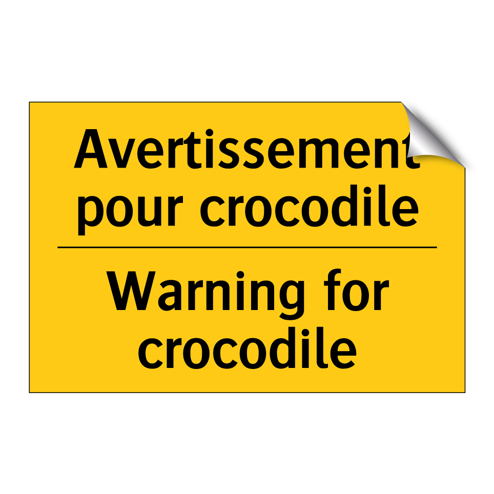 Panneau d'avertissement bilingue avec texte en français : "Avertissement pour crocodile", et en anglais : "Warning for crocodile"