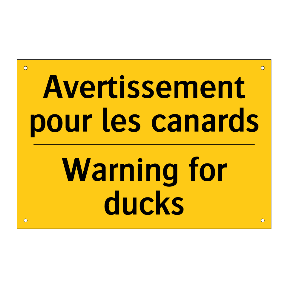 Panneau d'avertissement bilingue avec texte en français : "Avertissement pour les canards", et en anglais : "Warning for ducks"