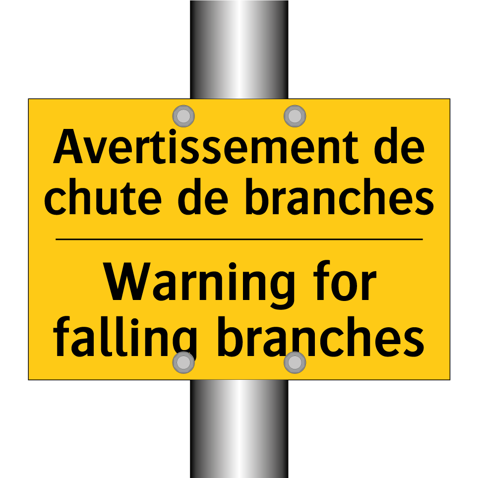 Panneau d'avertissement bilingue avec texte en français : "Avertissement de chute de branches", et en anglais : "Warning for falling branches"
